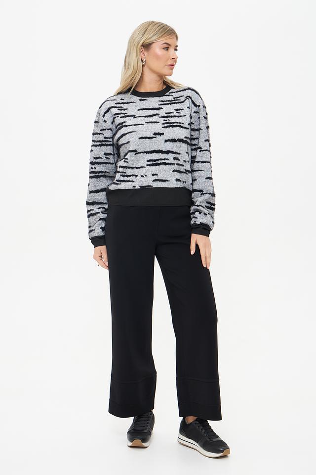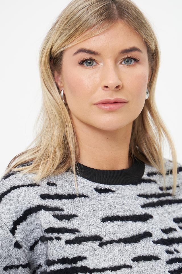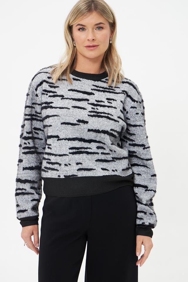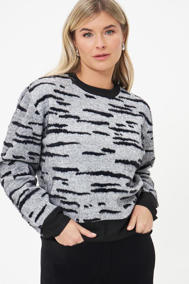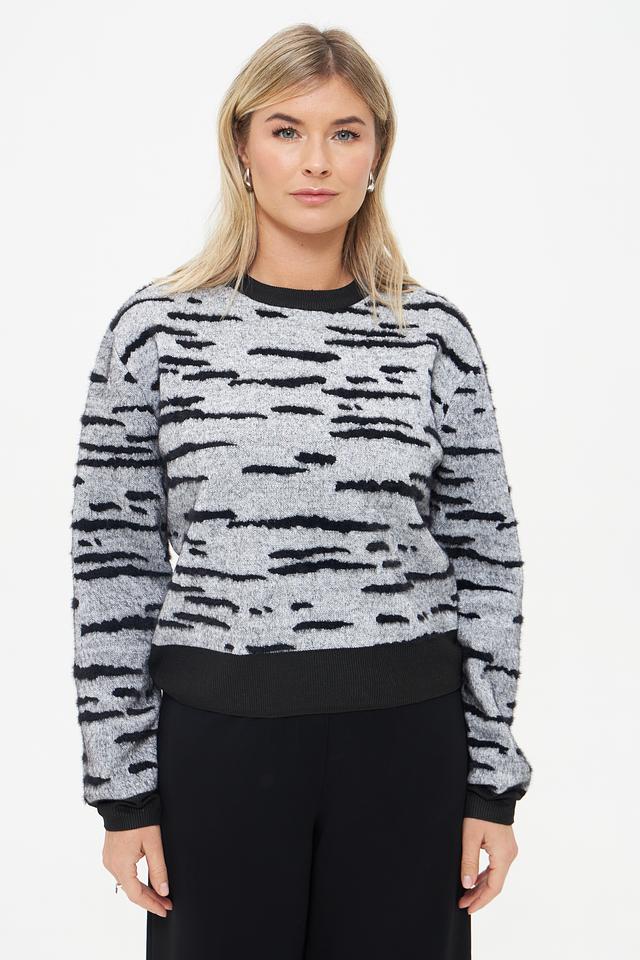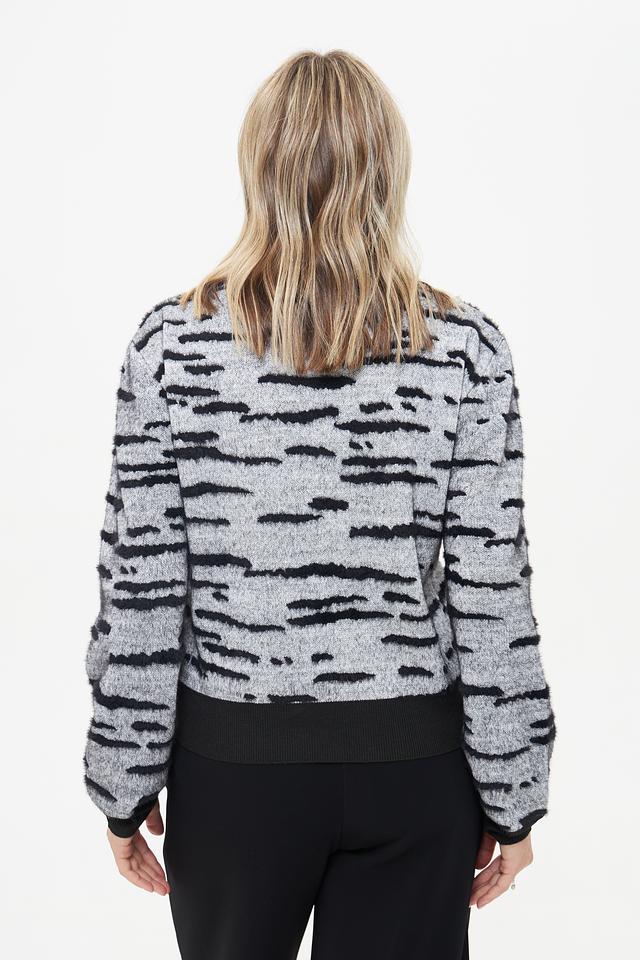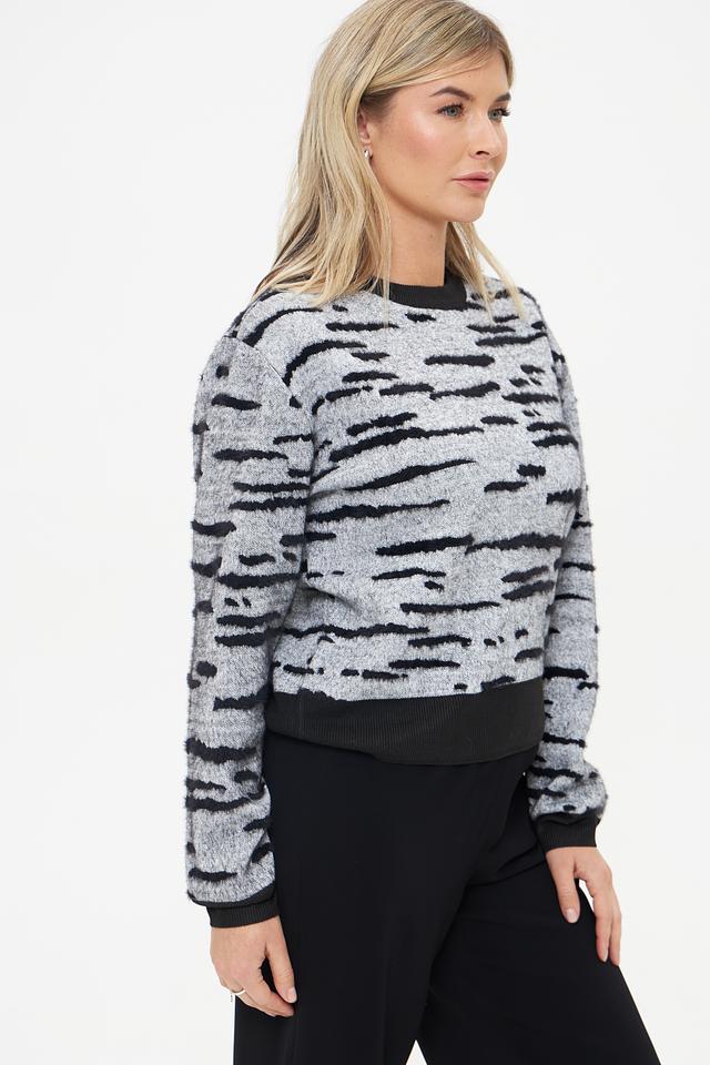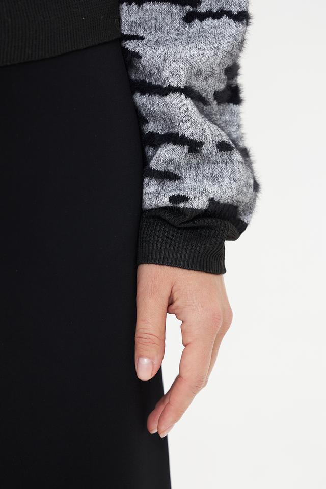 Основной цвет пуловера – серый, но его поверхность украшена выразительным узором, имитирующим шкуру зебры, выполненным в чёрных тонах. Такое сочетание делает этот пуловер ярким и запоминающимся элементом вашего стиля.