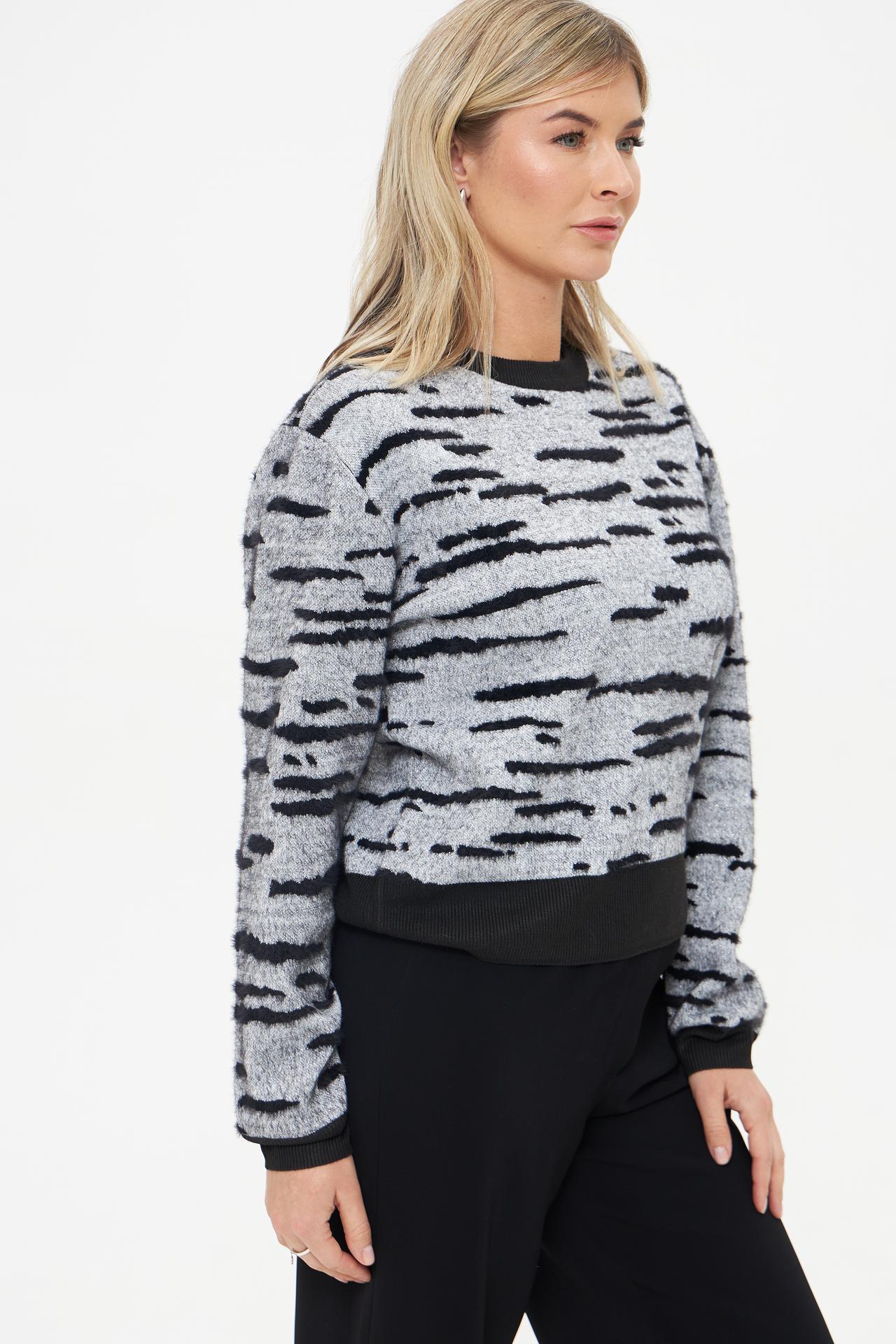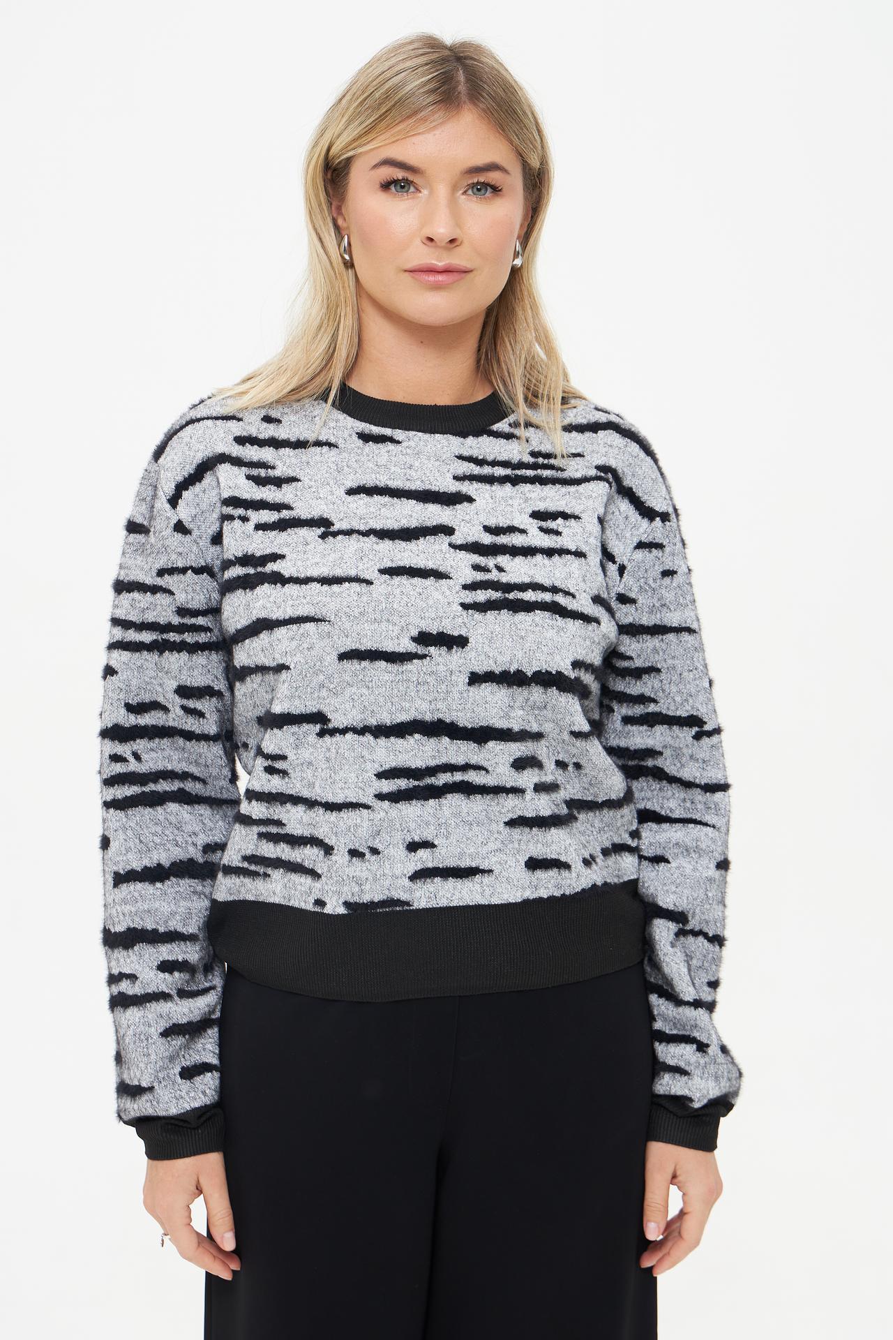 - Дизайн: Современный пуловер с круглым вырезом и длинными рукавами. Оригинальный принт и фактурная вязка добавляют изюминку.