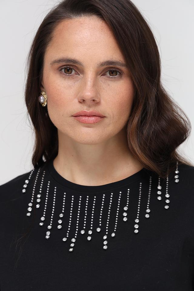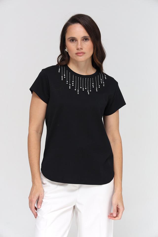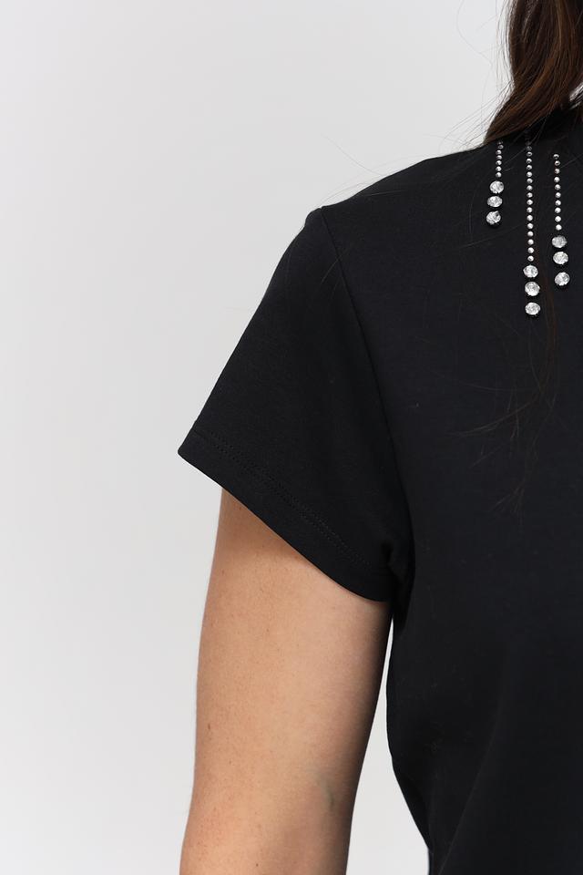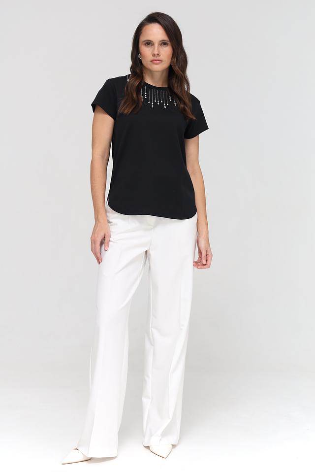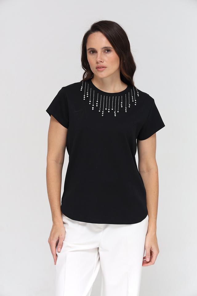 Футболка имеет классический крой с короткими рукавами и округлым вырезом горловины. Особый акцент сделан на декор – область горловины украшена аккуратно выложенными стразами, которые придают изделию изысканность и блеск.