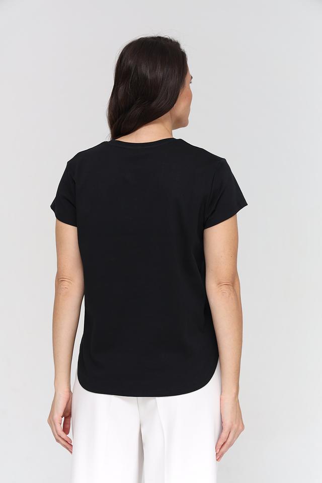 Чёрный цвет футболки делает её универсальной и легко сочетаемой с различными элементами одежды. Она прекрасно подойдёт для создания как повседневных, так и более нарядных образов. Состав футболки – 100% органический хлопок, что гарантирует экологичность и безопасность для вашей кожи.