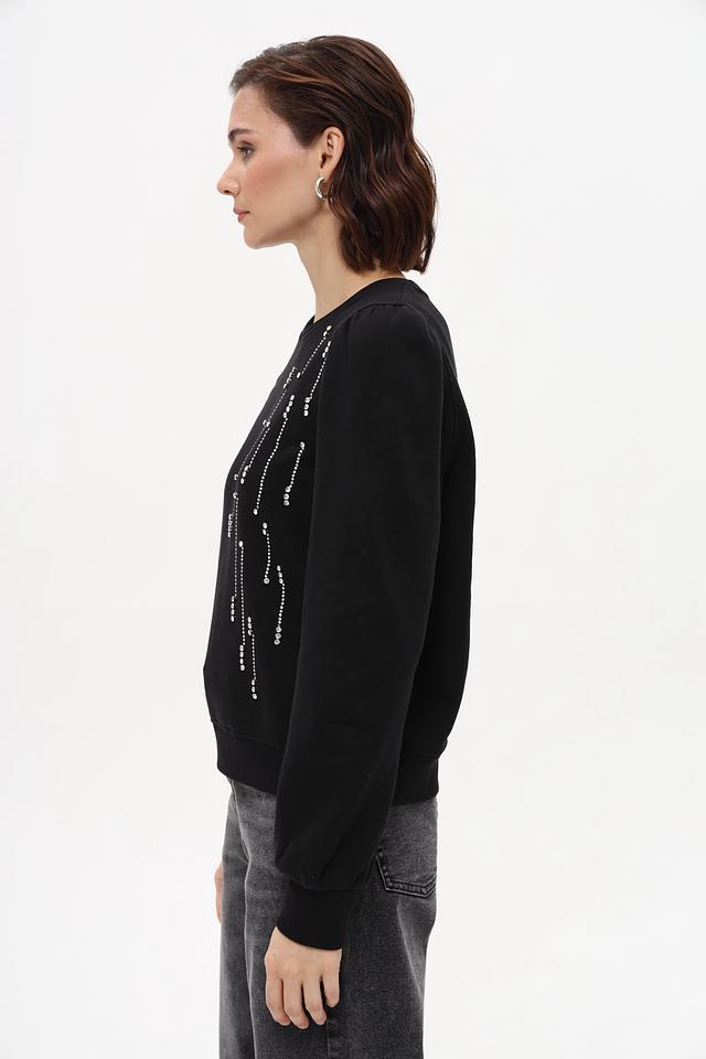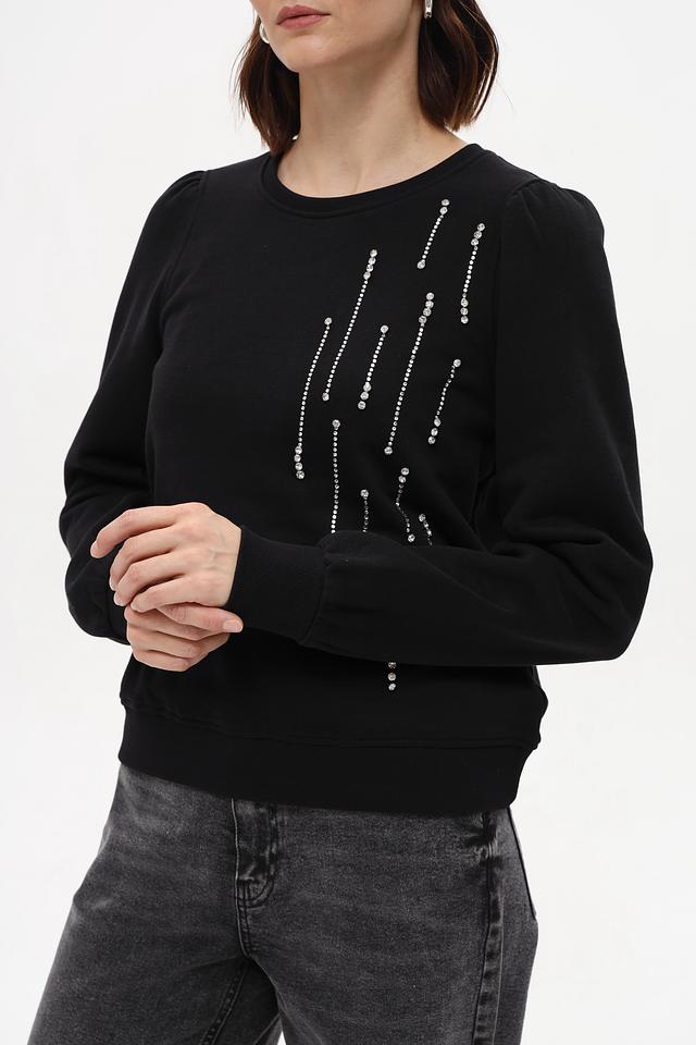 Особенностью данного пуловера является декор в виде вертикальных линий, выполненных в белом цвете. Этот элемент придает изделию оригинальность и делает его более интересным. Свободный крой и слегка спущенная линия плеч обеспечивают свободу движений и расслабленный образ.