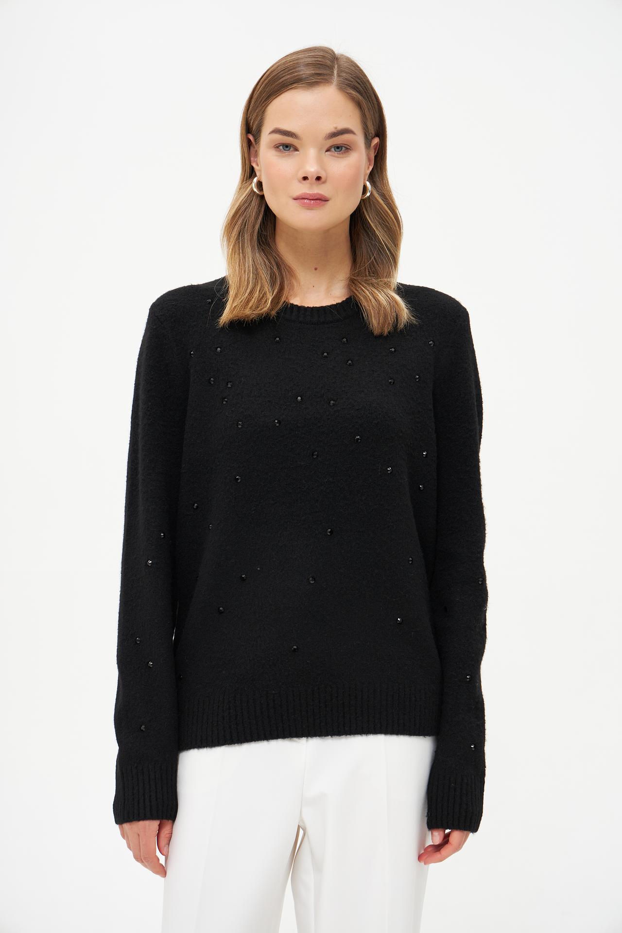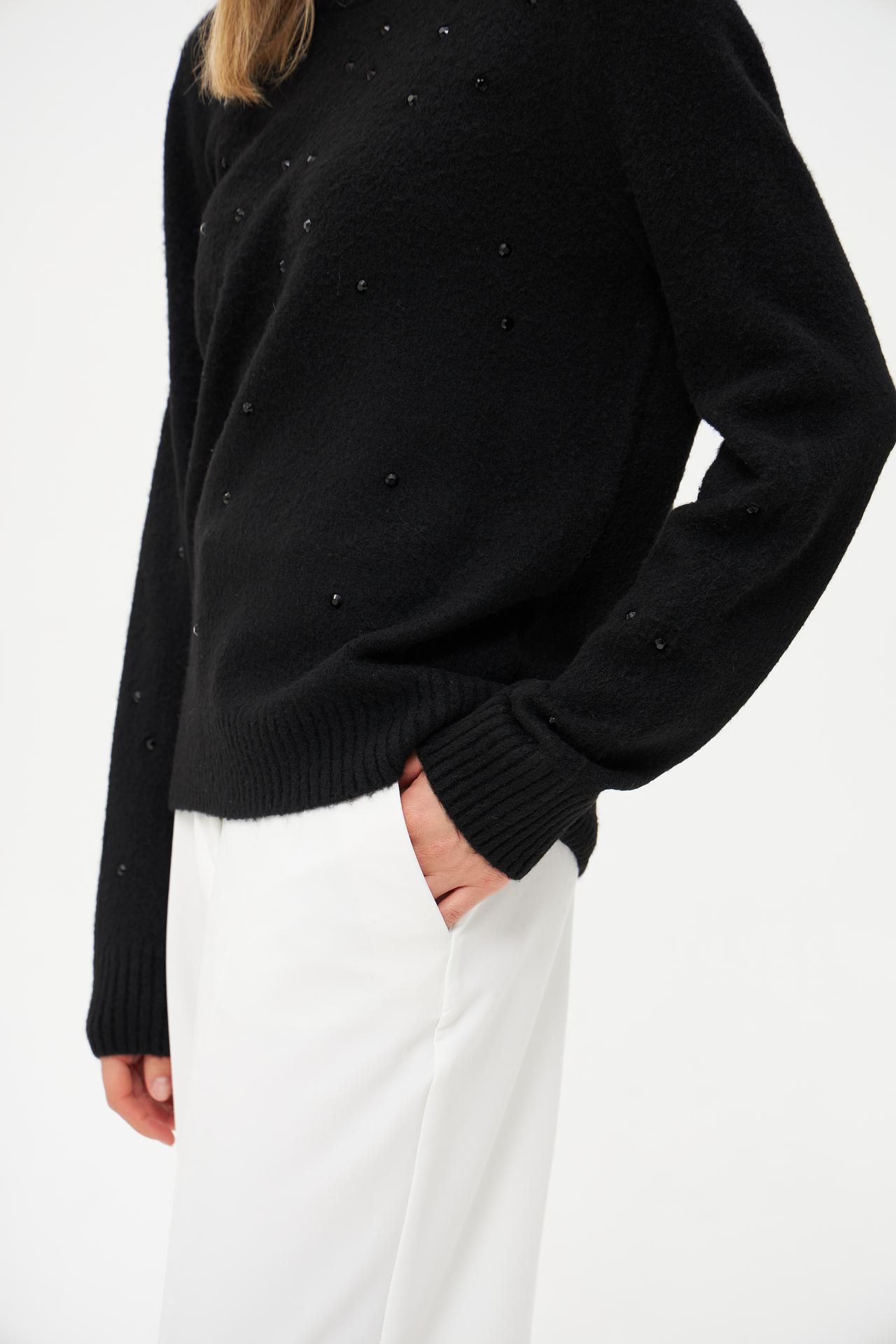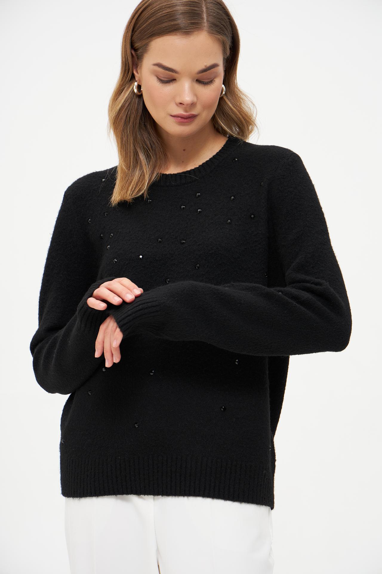- Дизайн и декор: Лаконичный крой с круглым вырезом и длинными рукавами дополнен деликатным декором из пайеток, расположенных по всей поверхности изделия. Этот элемент придает модели особое очарование и делает ее уникальной.