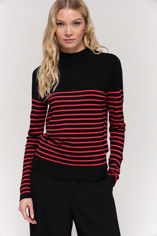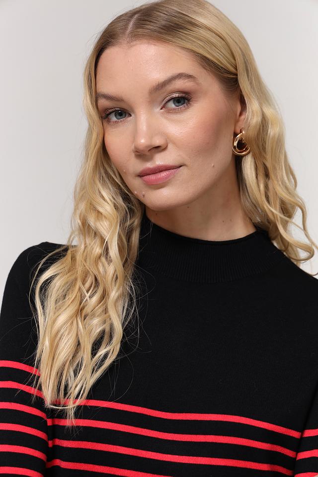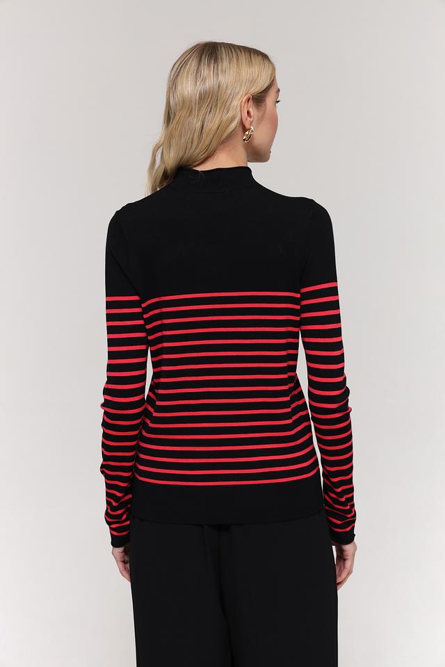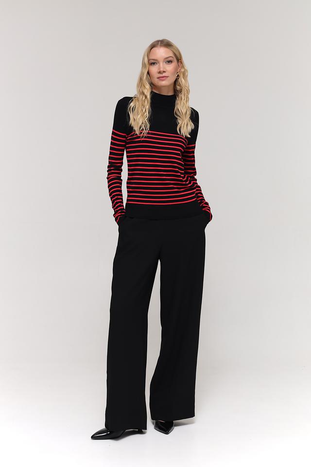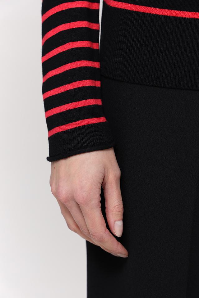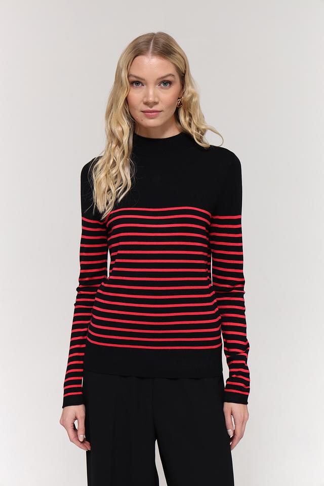 Основной цвет пуловера – чёрный, а яркий акцент расставлен благодаря красному полосатому узору. Такое сочетание делает изделие универсальным и подходящим для различных образов.