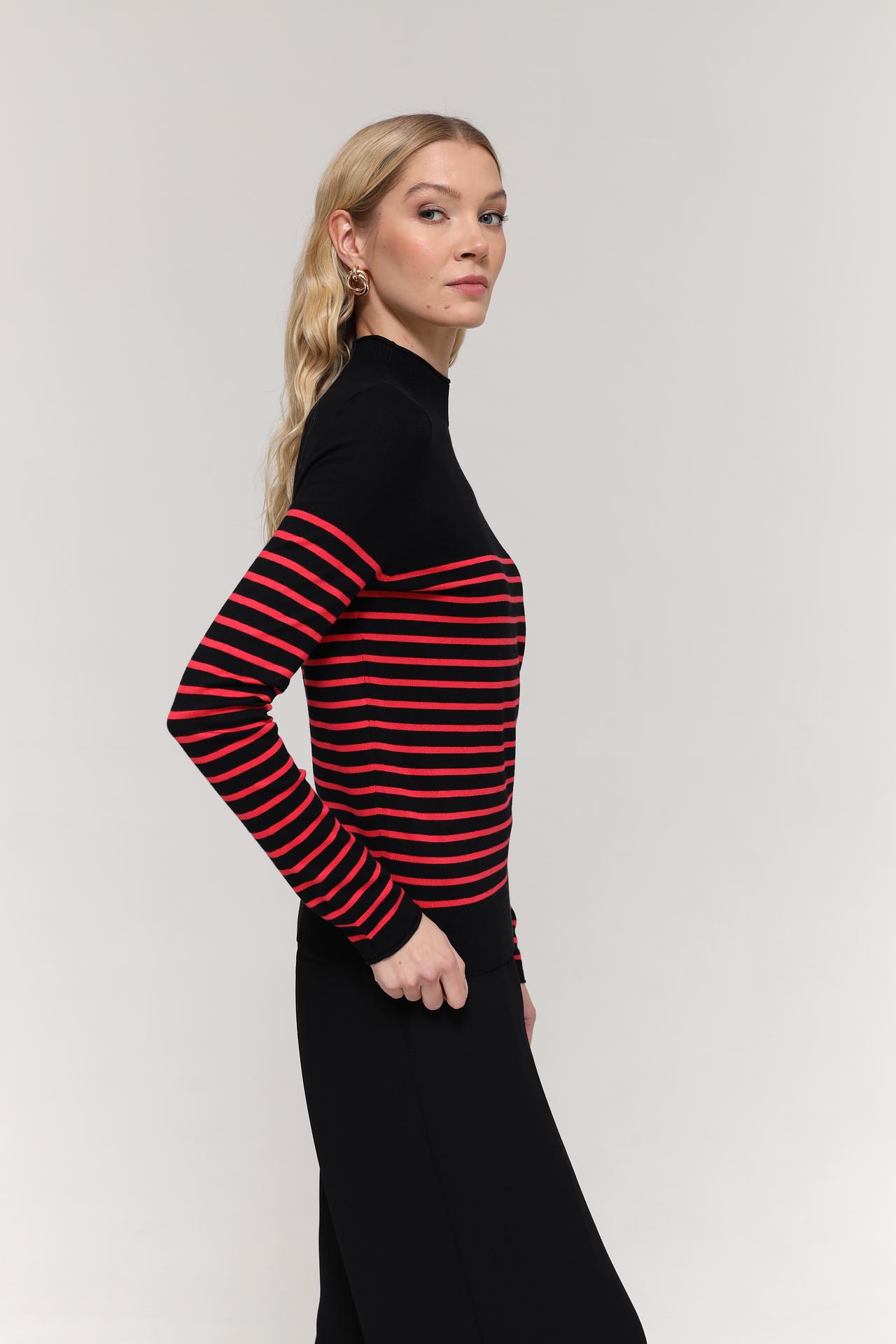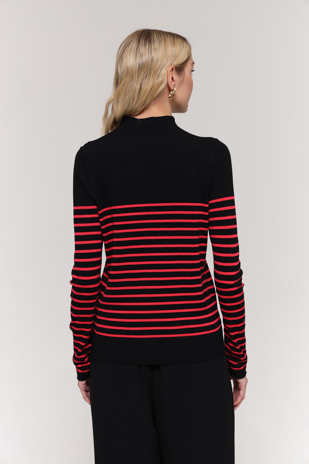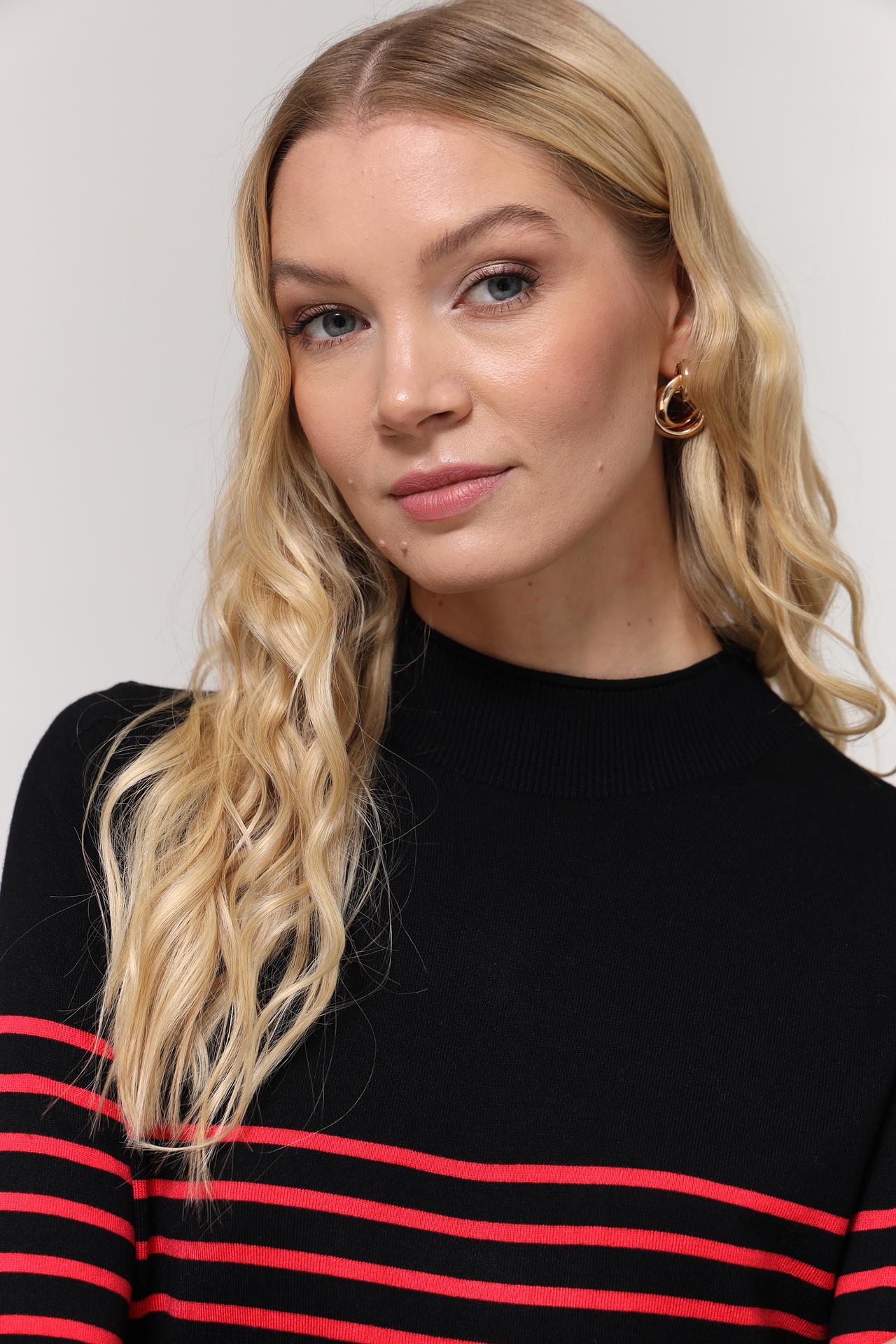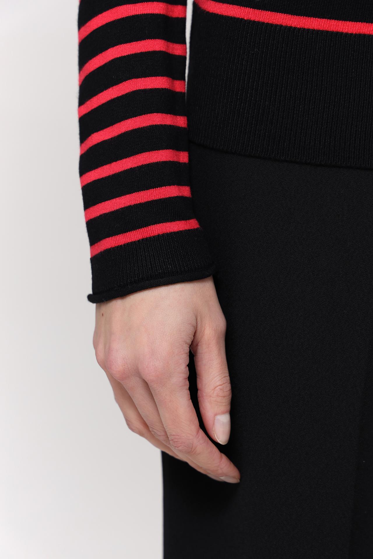 Стильный женский пуловер от бренда Taifun, выполненный в классическом сочетании черного и красного цветов. Дизайн в горизонтальную полоску придает изделию динамичность и визуально стройнит фигуру. Высокий воротник-стойка обеспечивает дополнительный комфорт и защиту от холода.