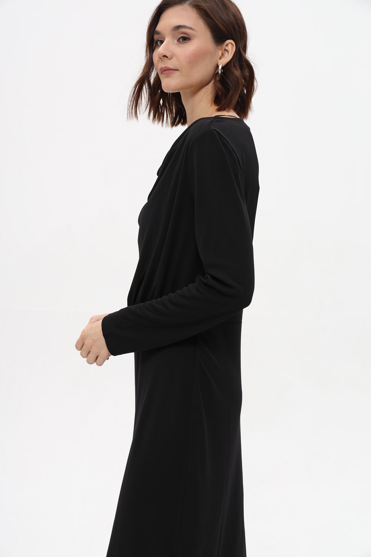 Модель с длинными рукавами и эффектной драпировкой на груди добавляет образу женственности и утонченности. Приталенный силуэт выгодно подчеркивает достоинства фигуры, а длина миди делает платье универсальным для различных мероприятий.