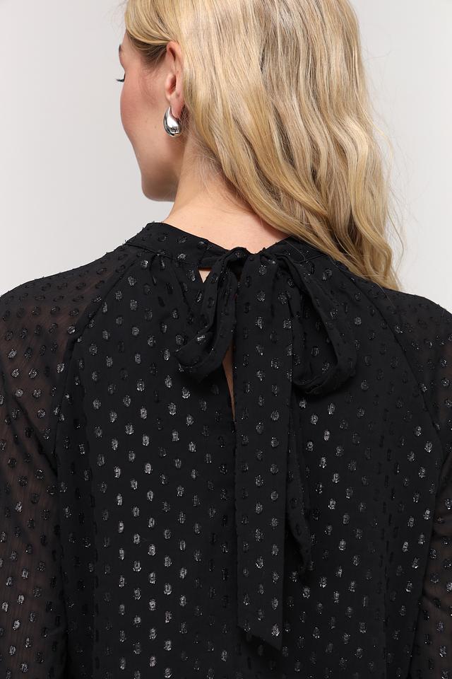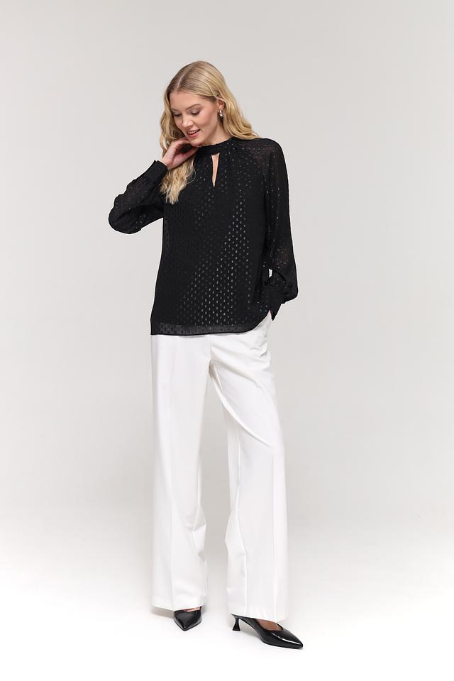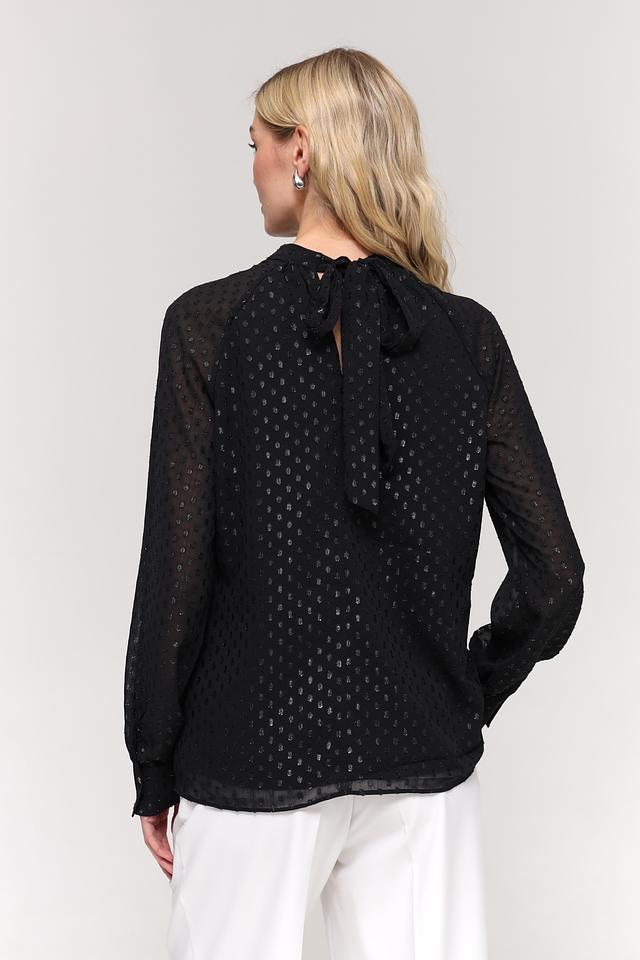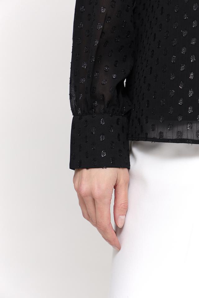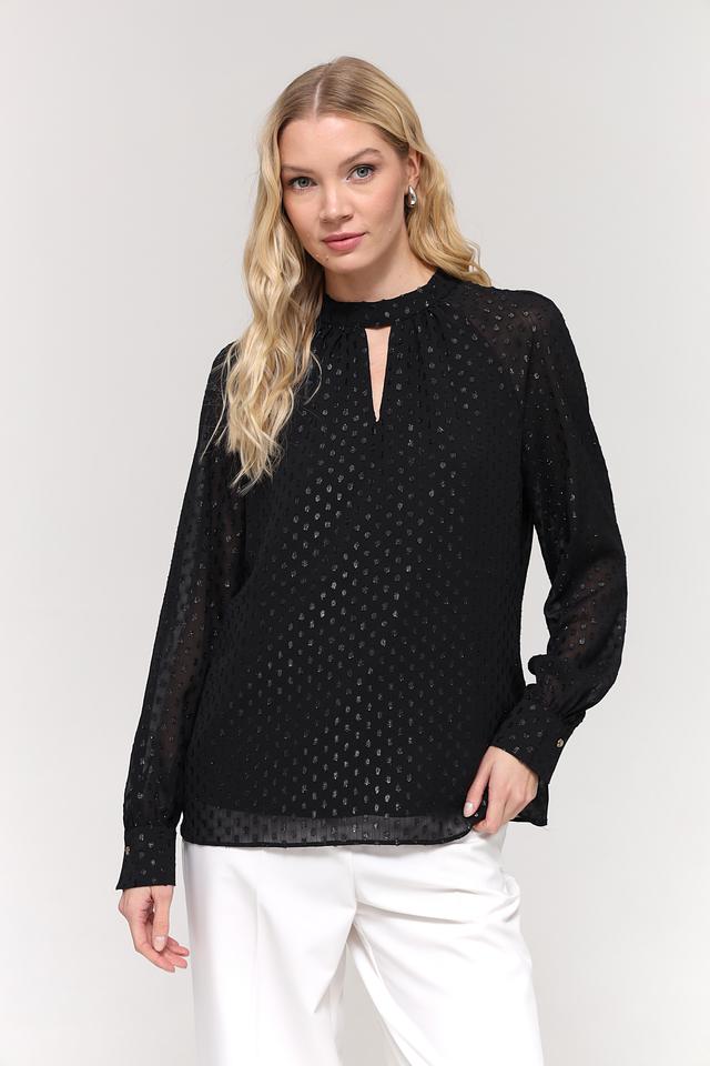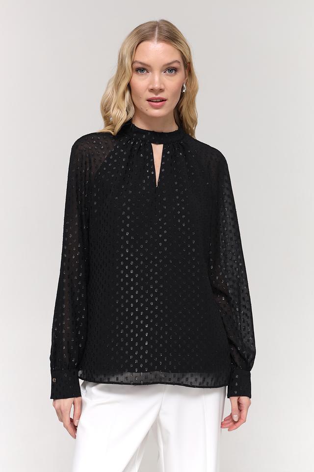 Чёрный цвет блузы украшен мерцающими золотистыми пайетками, которые придают ей праздничный и привлекательный вид. Вырез горловины в форме капли добавляет образу женственности и оригинальности. Длинные рукава с небольшими манжетами завершают стильный силуэт.
