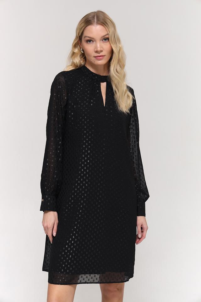 Чёрное платье от Taifun – это элегантная модель с длинными рукавами и небольшим вырезом на горловине. Платье выполнено из полиэстера с деликатным узором, что придает ему особый шарм и текстуру. Состав: полиэстер 100%