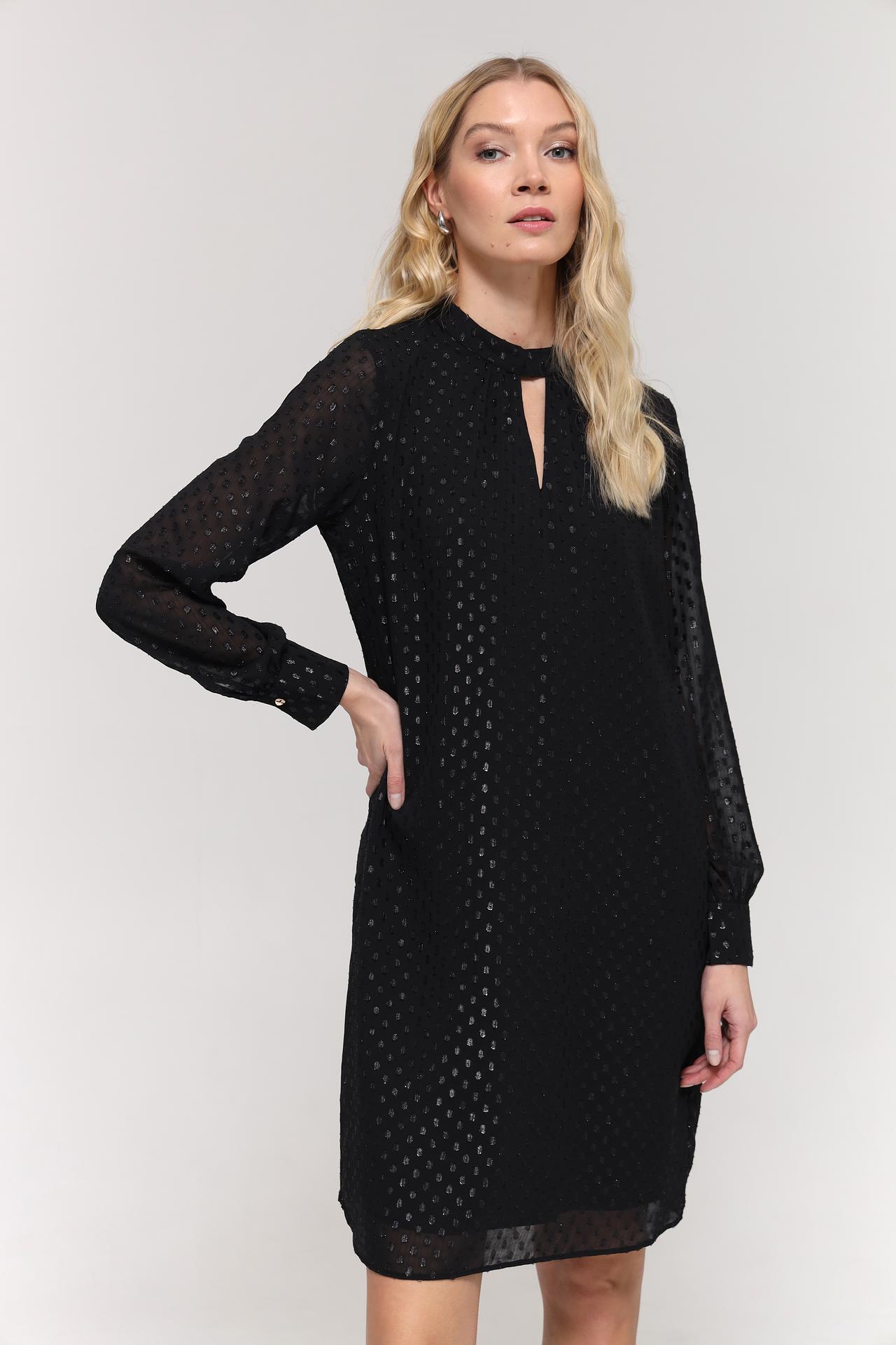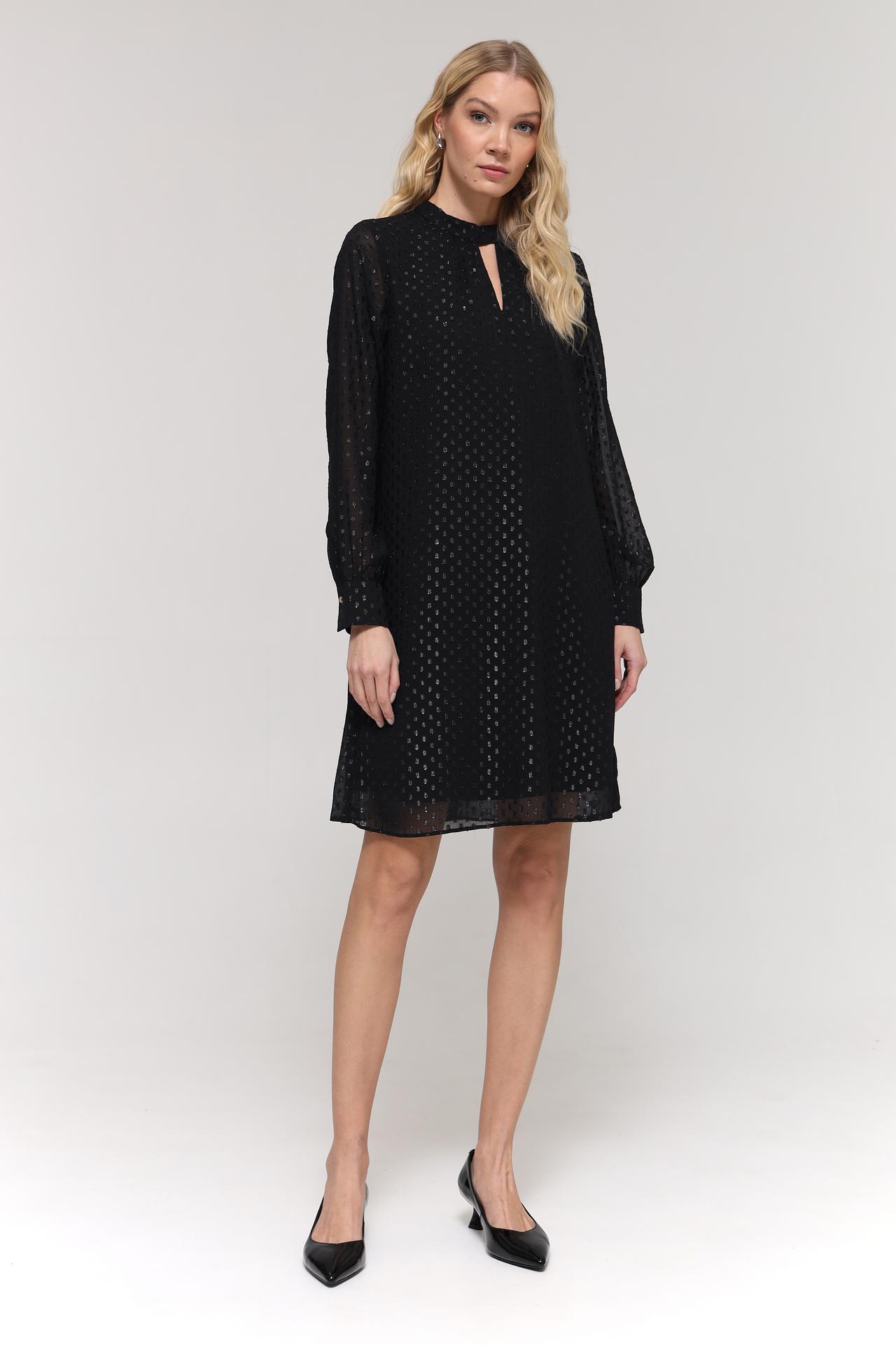 Элегантное черное платье от Taifun — идеальный выбор для создания утонченного образа. Полупрозрачная ткань с мерцающим узором в горошек придает модели особую изысканность. Длинные рукава и высокий воротник-стойка с вырезом-каплей создают элегантный силуэт, а акцентная деталь в виде банта на спине добавляет образу женственности и очарования. Это платье прекрасно подойдет как для торжественных мероприятий, так и для создания стильного повседневного наряда.
