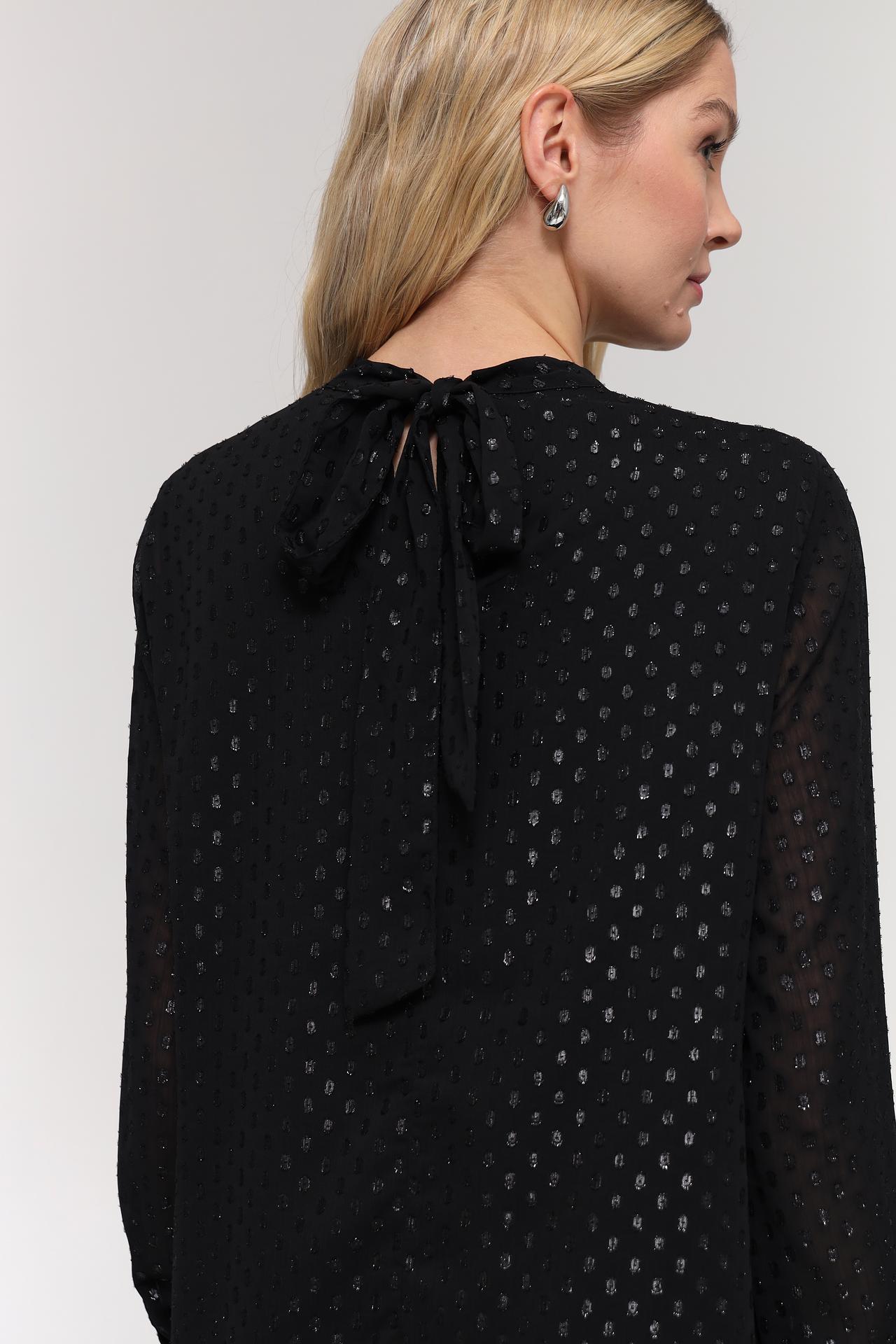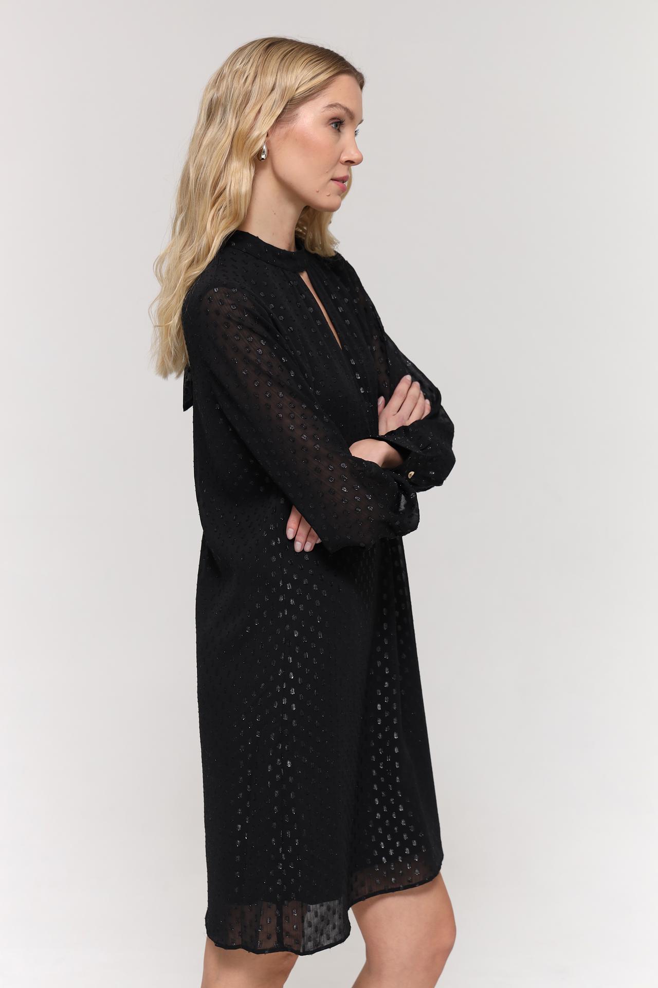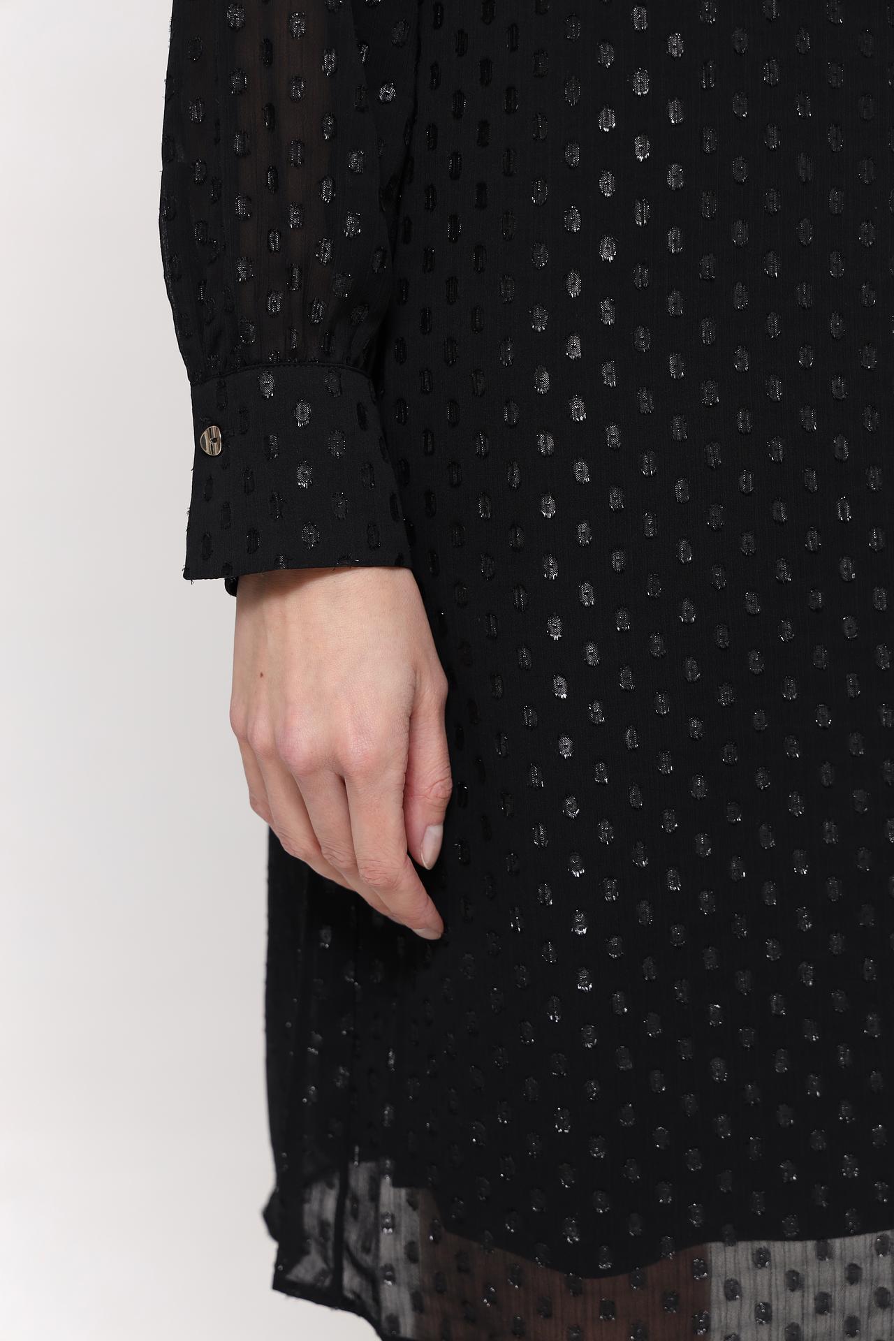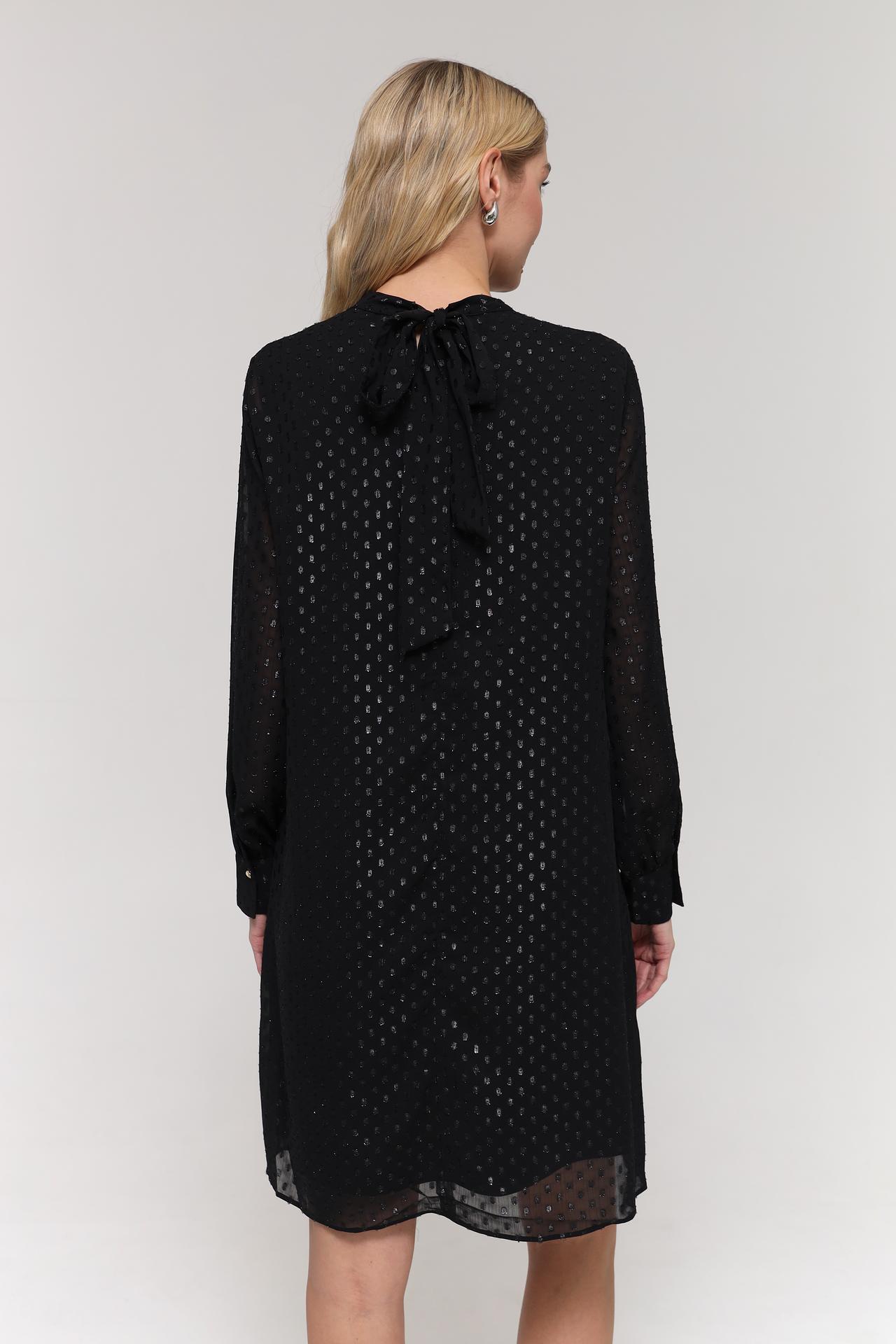 - Дизайн: Классический черный цвет в сочетании с деликатным узором в мелкий горошек создает элегантный и актуальный образ. Вырез-капля на воротнике и бант на спине придают платью изюминку.