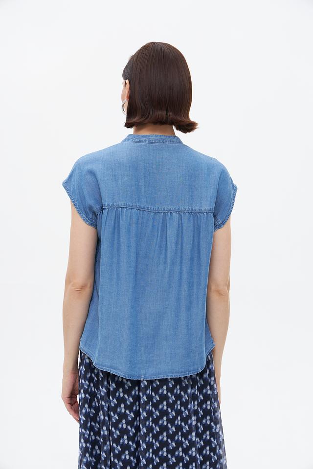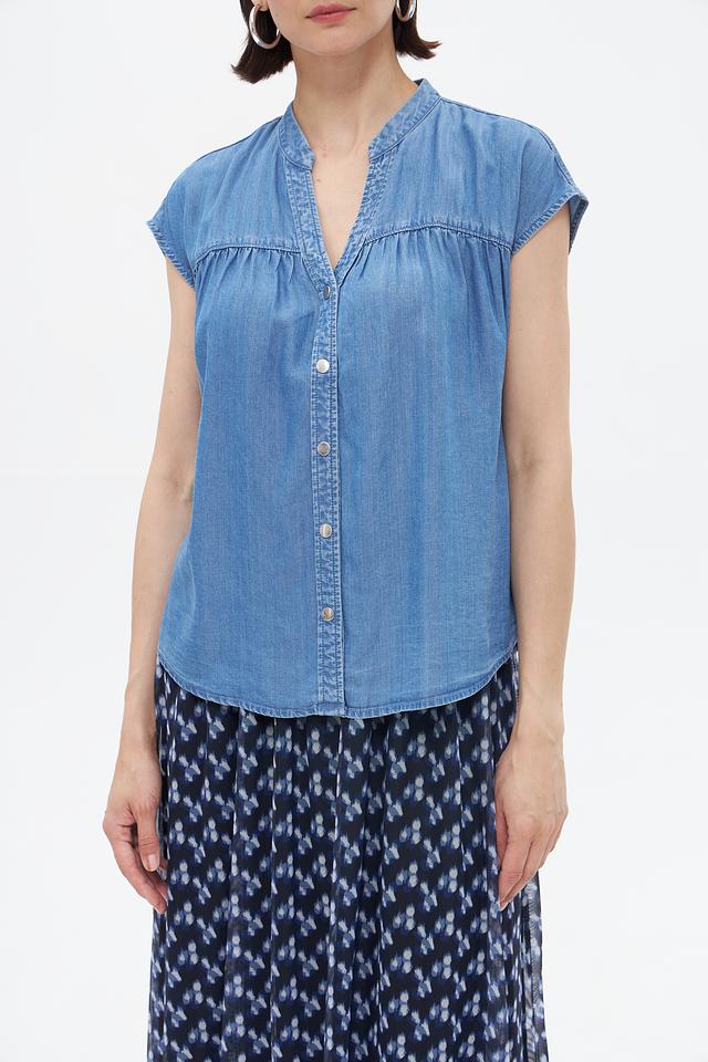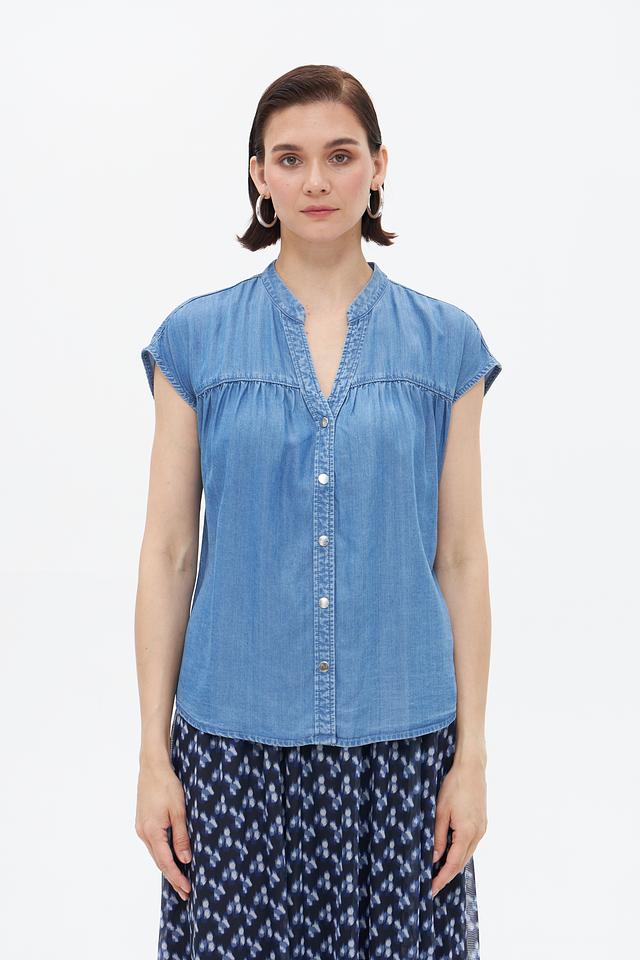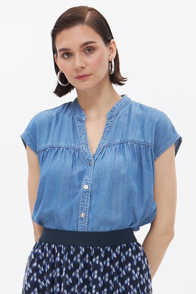 Джинсовая блуза Taifun голубого цвета с короткими рукавами-крылышками и V-образным вырезом. Изготовлена из 100% лиоцела, обеспечивающего комфорт и воздухопроницаемость. Состав: лиоцел 100%