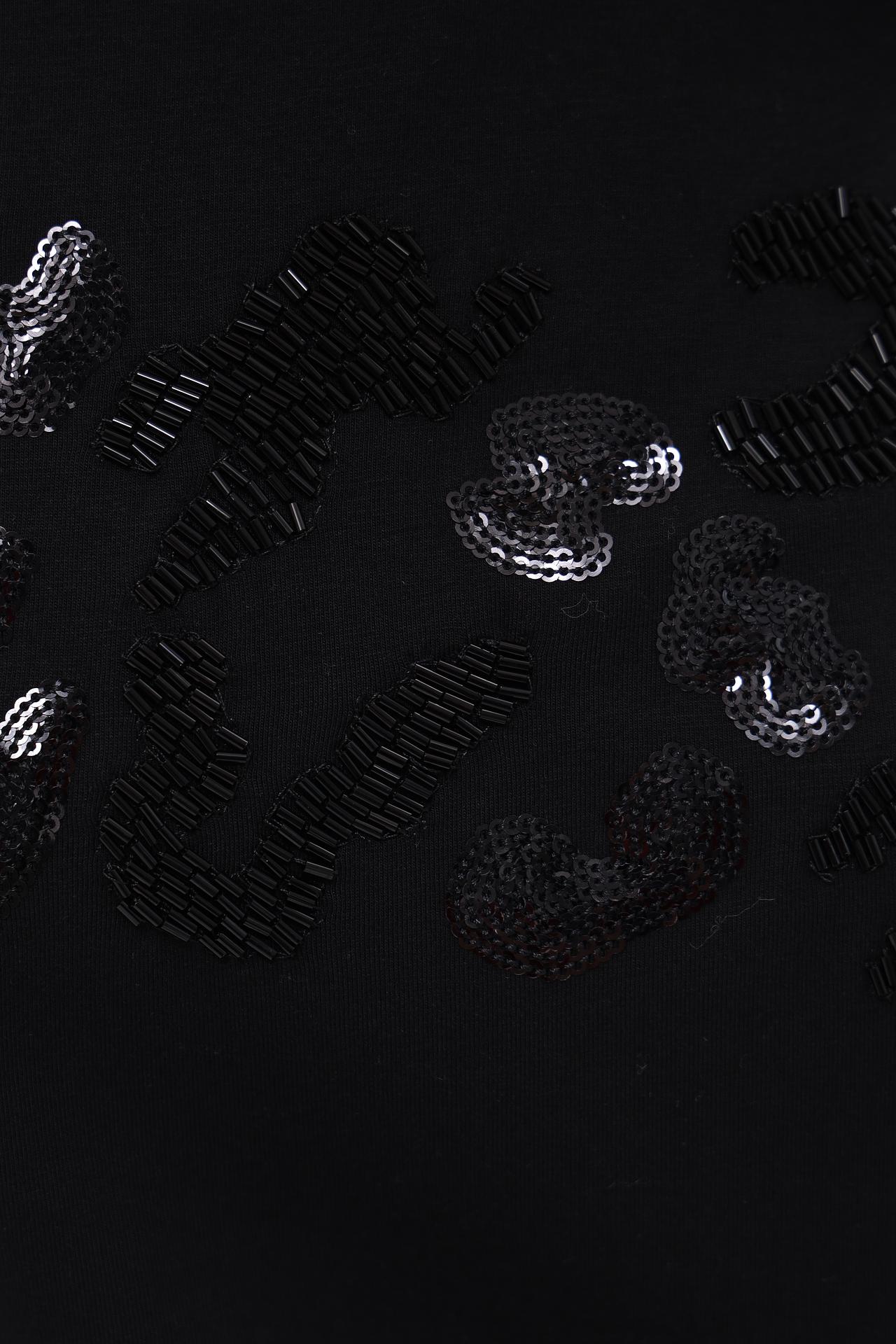 - Дизайн: Классический черный цвет и лаконичный крой делают эту футболку универсальной. Вышивка пайетками и бисером добавляет изюминку и привлекает внимание.