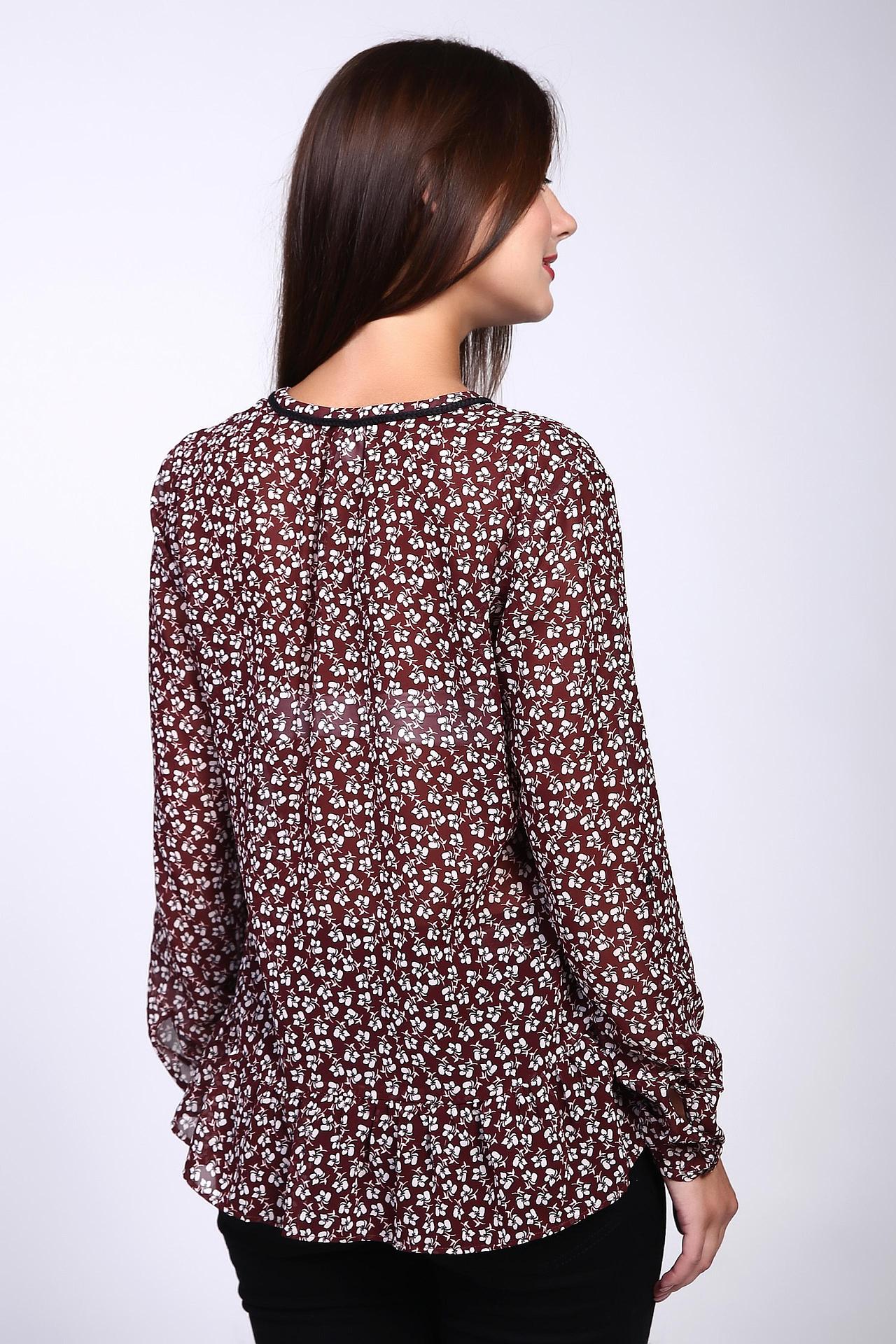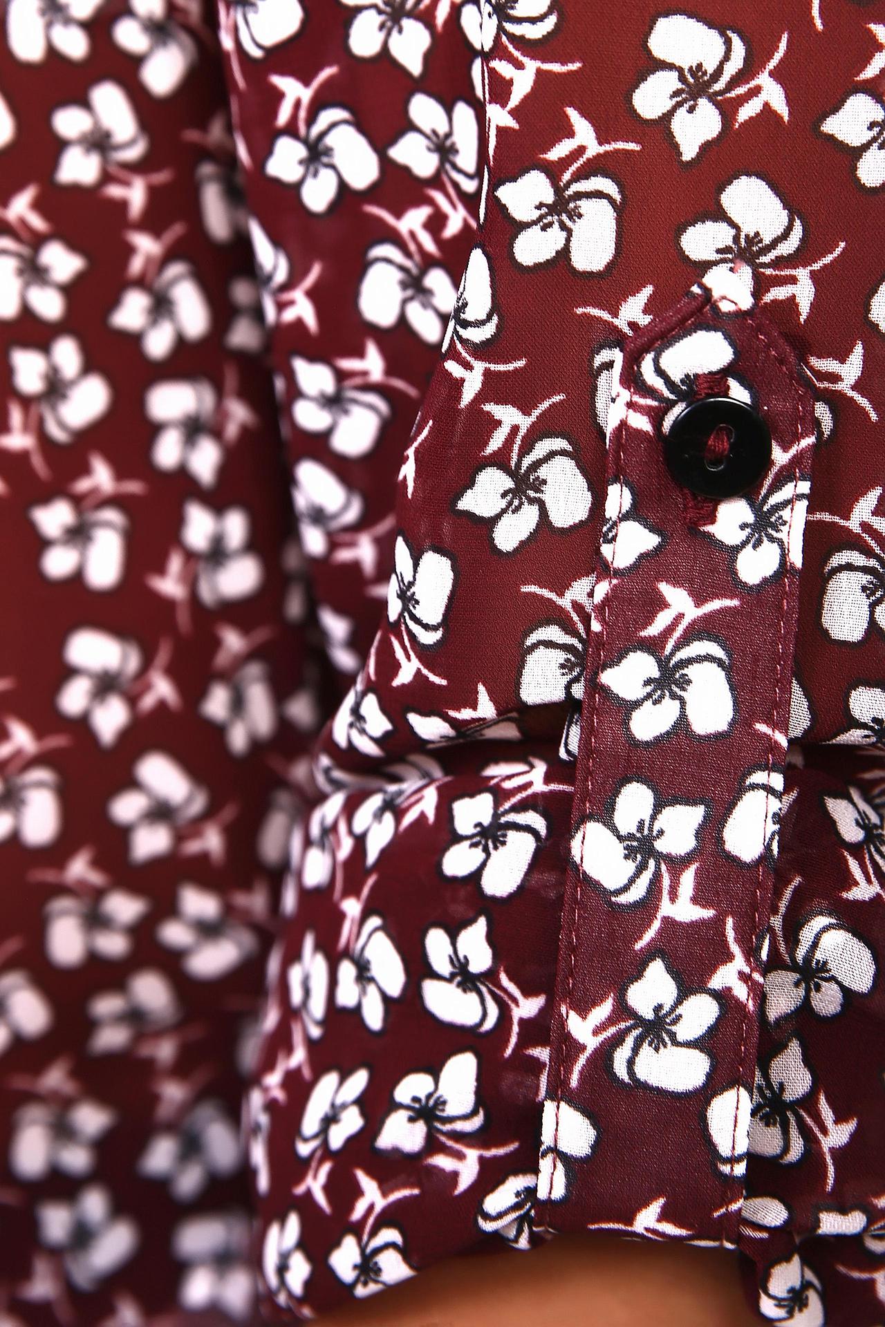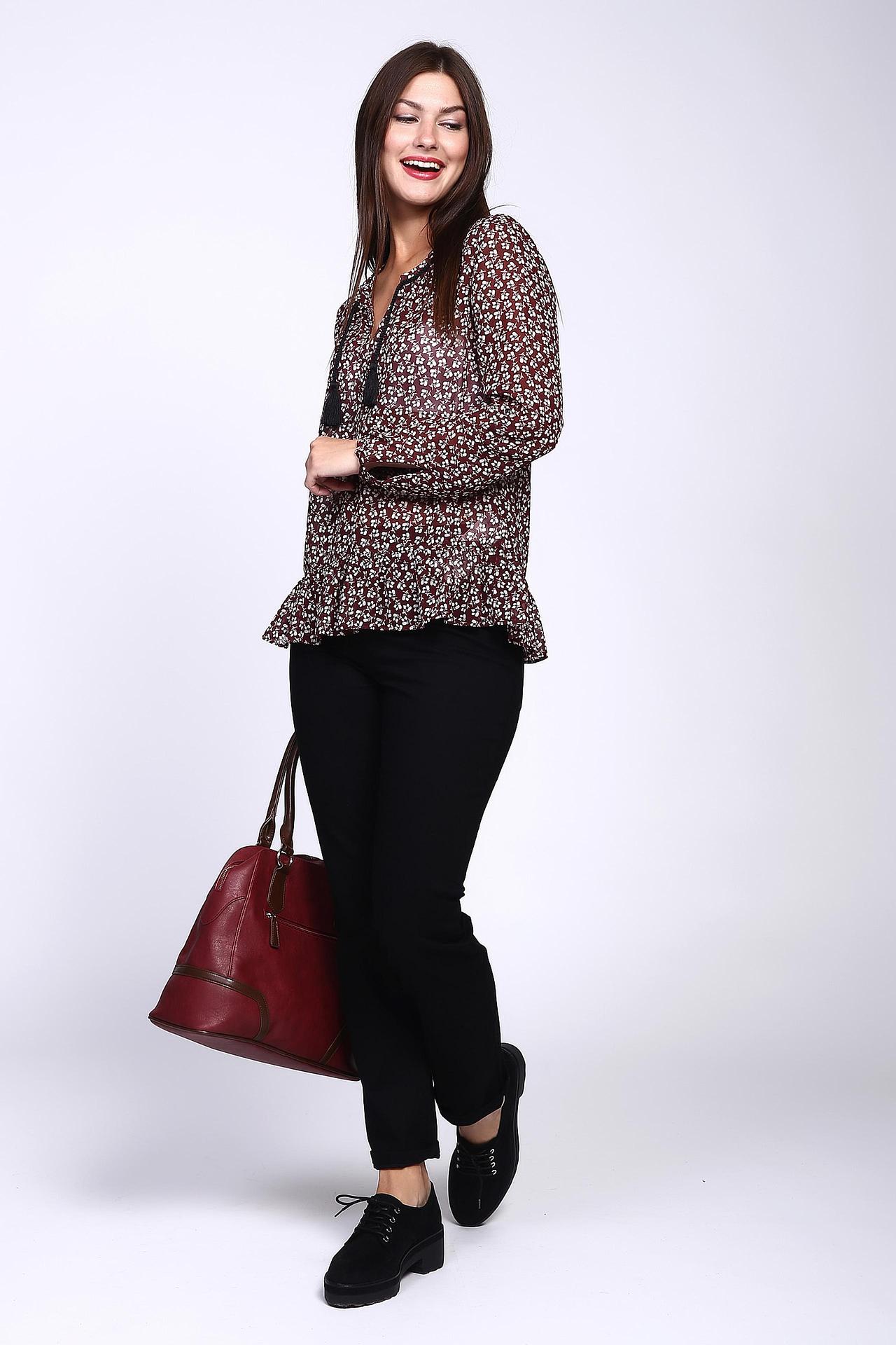 Блуза фирмы Taifun бордового цвета имеет цветастый принт. Модель свободного прямого покроя. Ворот округлый с разрезом впереди, обшит декоративным шнуром , который завязывается. Модель дополнена длинными рукавами с застежкой на пуговицу. Низ блузки оформлен прекрасной баской. Блуза очень красива и удобна.