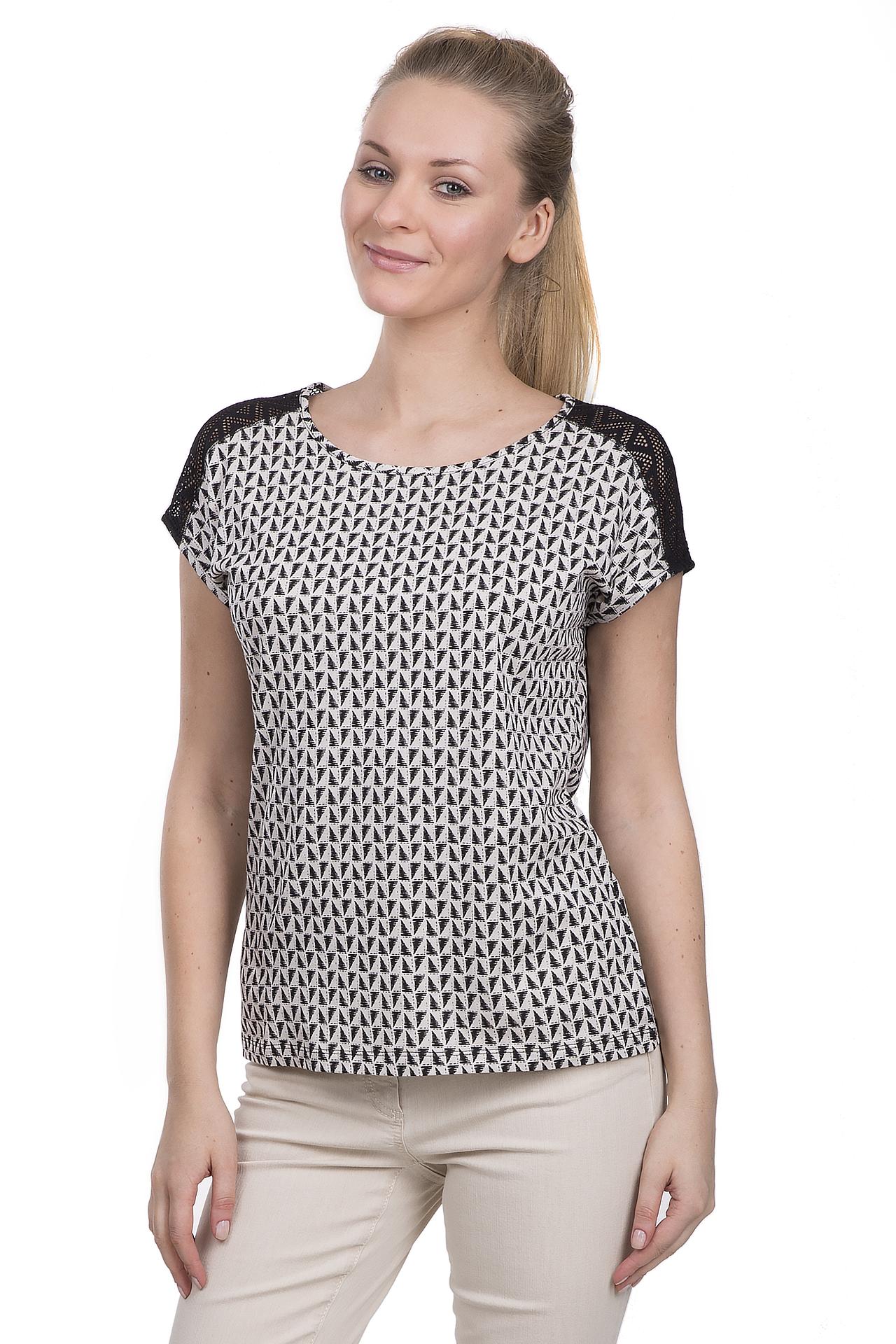 Стильная женская блуза от бренда Taifun. Данная блуза выполнена в черно-белых тонах, с оригинальными ромбовидными орнаментами и кружевными вставками на плечах. У данного изделия круглый вырез и короткий рукав. Эту блуза пошита из смеси модала и хлопка.