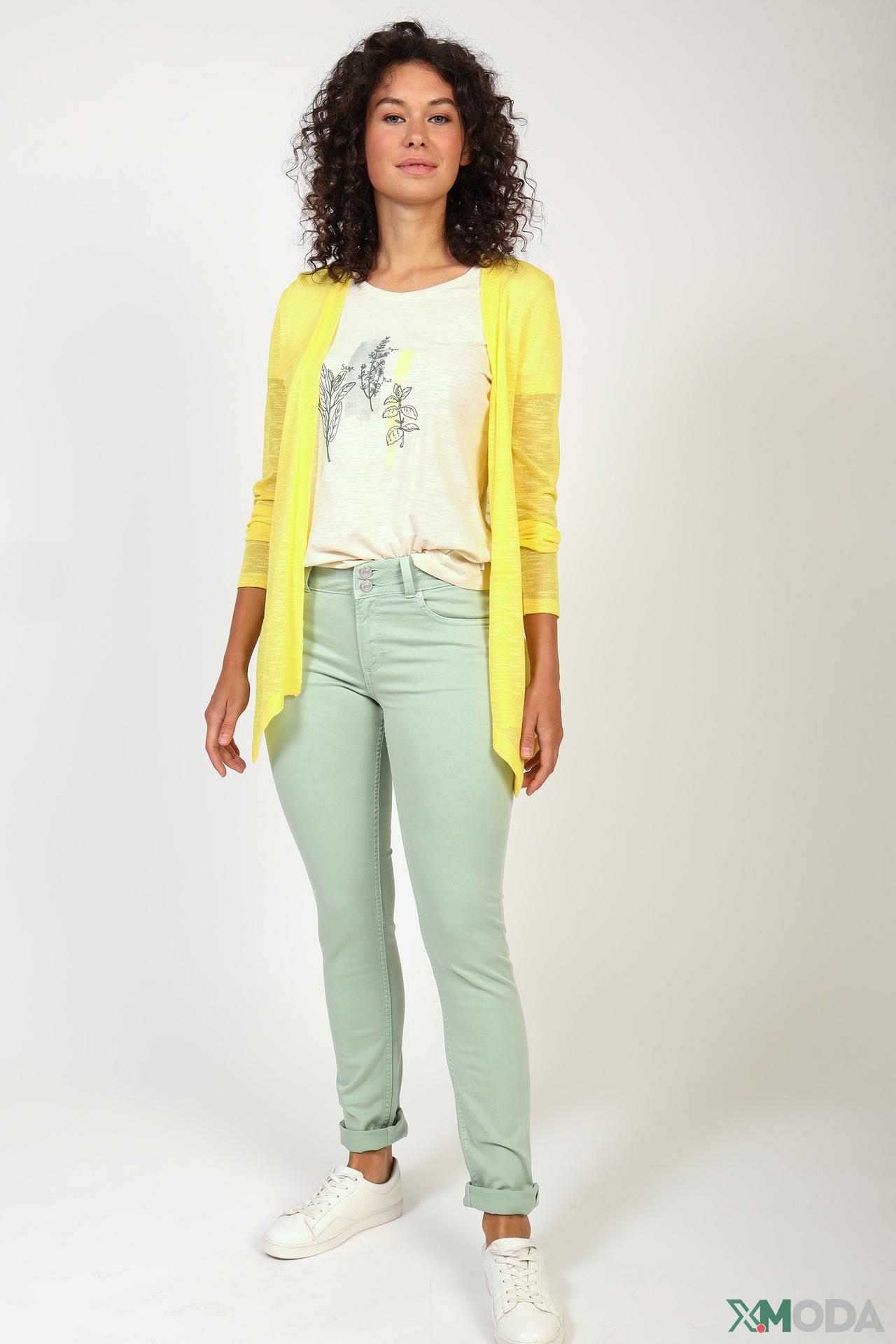 - Яркий цвет: Желтый кардиган придает образу свежесть и неповторимость.