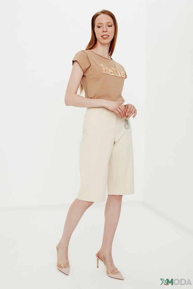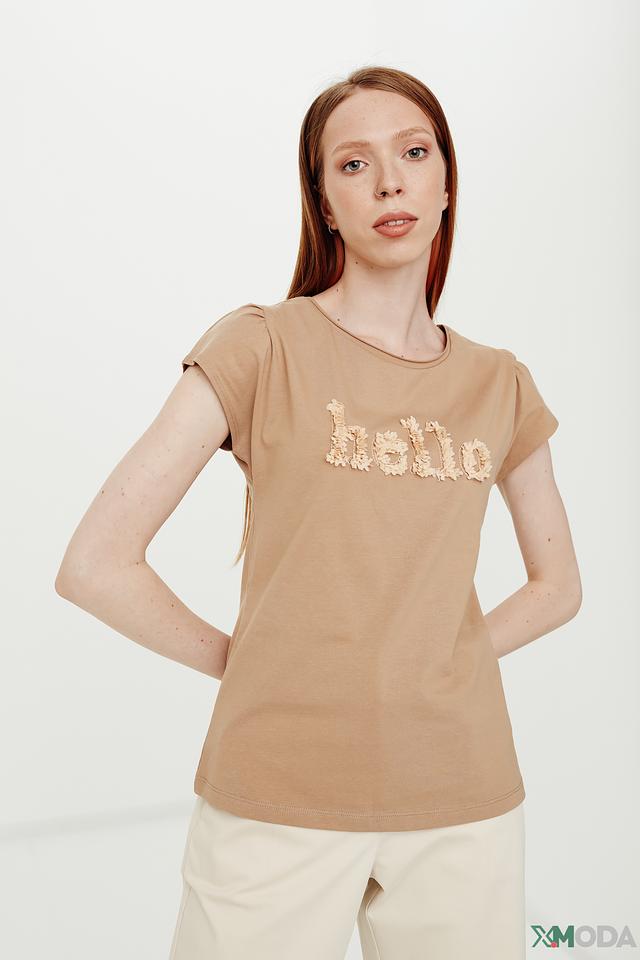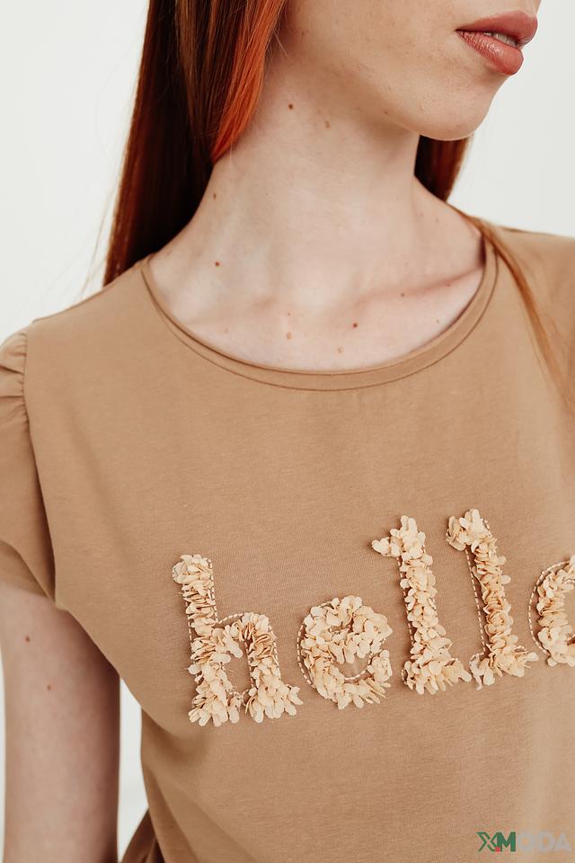 Основной цвет футболки – бежевый, который легко сочетается с другими элементами гардероба. Главная особенность модели – декоративная надпись "hello", выполненная в виде аппликаций. Это придает футболке оригинальность и индивидуальность.
