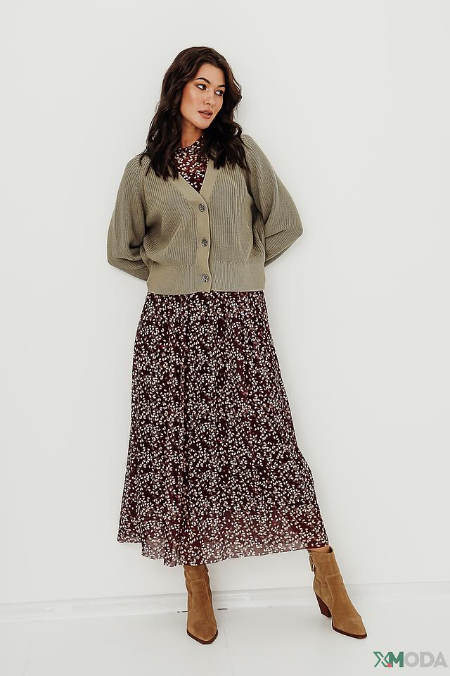 Кардиган имеет классический V-образный вырез и застегивается на ряд пуговиц. Особенности кроя включают слегка спущенные рукава и свободный силуэт, что делает его универсальным для различных типов фигур.