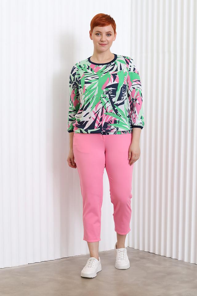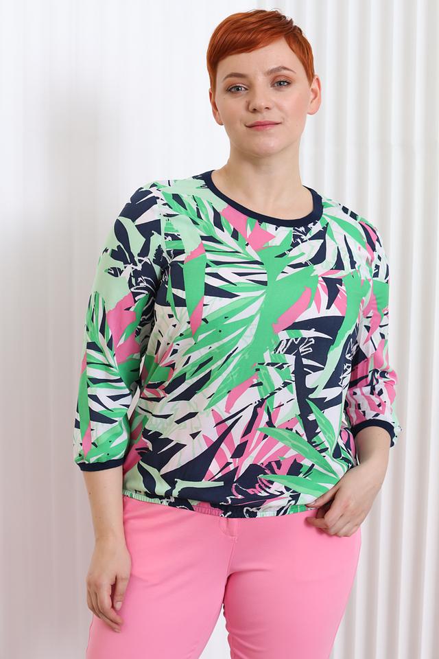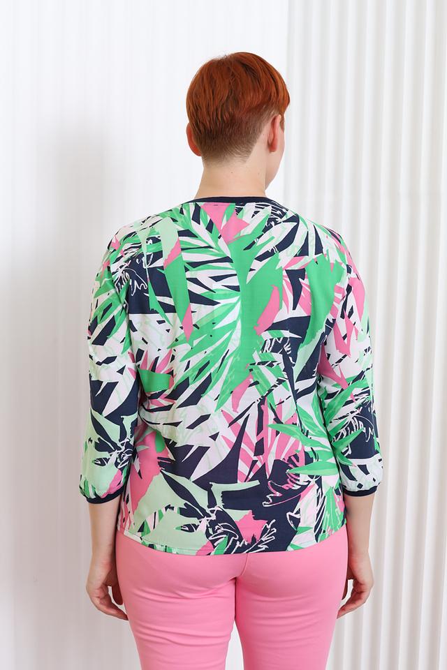 Основной цвет блузы – зеленый, но она украшена красочным тропическим принтом, включающим в себя оттенки розового, синего и белого. Эта блуза идеально подойдет для создания повседневных и праздничных образов. Ее можно сочетать с джинсами, брюками или юбками.