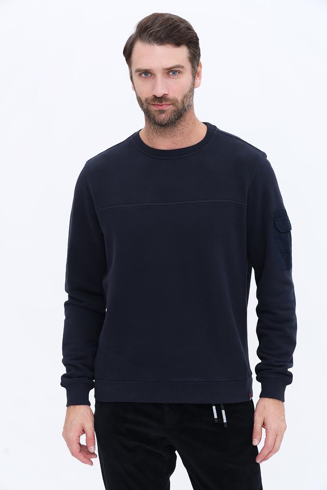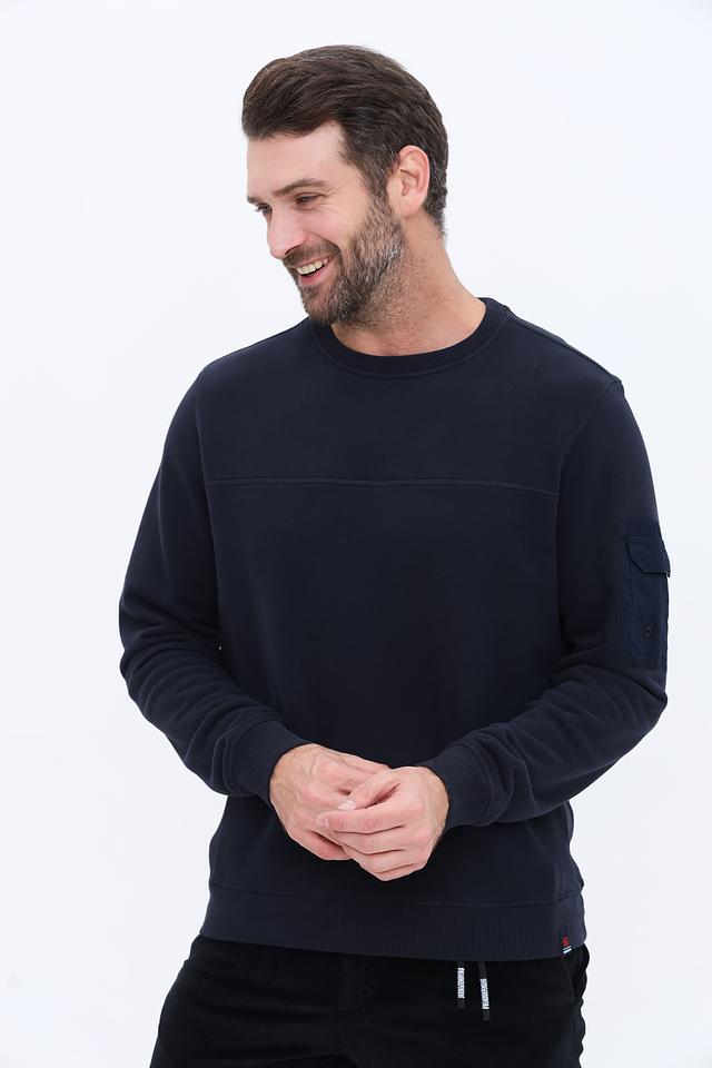 Джемпер имеет прямой крой, круглый вырез горловины и длинные рукава с манжетами. На груди расположена горизонтальная вставка, добавляющая визуальный интерес. С левой стороны на рукаве имеется накладной карман на молнии.