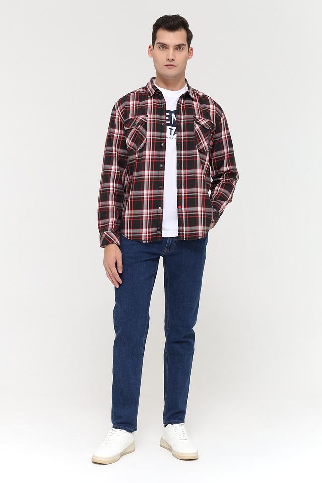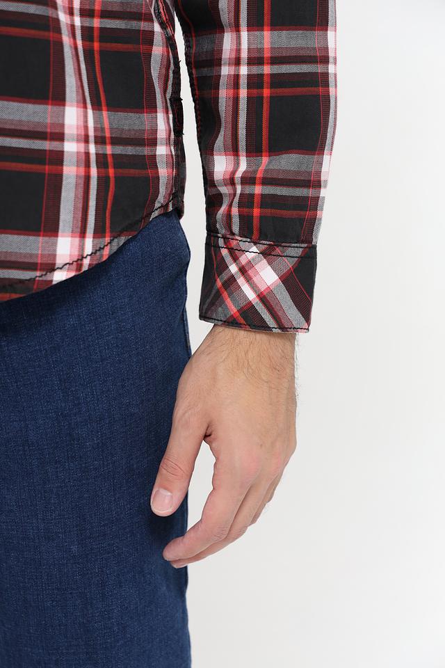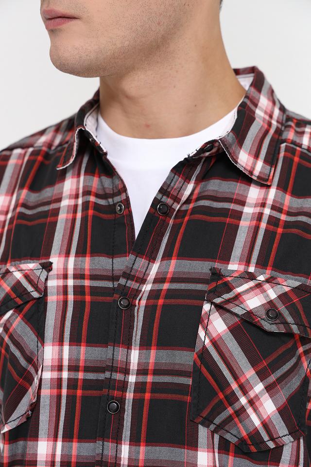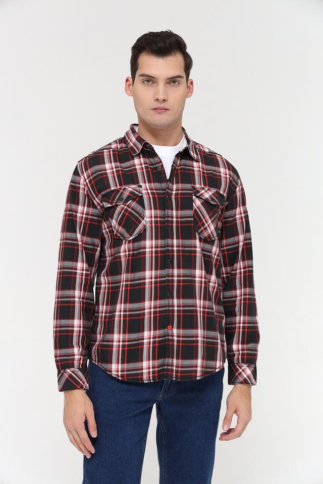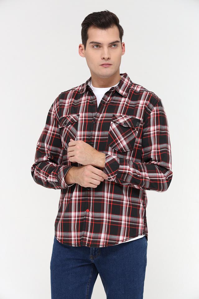 Основной цвет рубашки – чёрный, но яркий клетчатый рисунок включает в себя красный, серый и белый цвета. Рубашка имеет нагрудный карман с клапаном, который добавляет функциональности и стиля.
