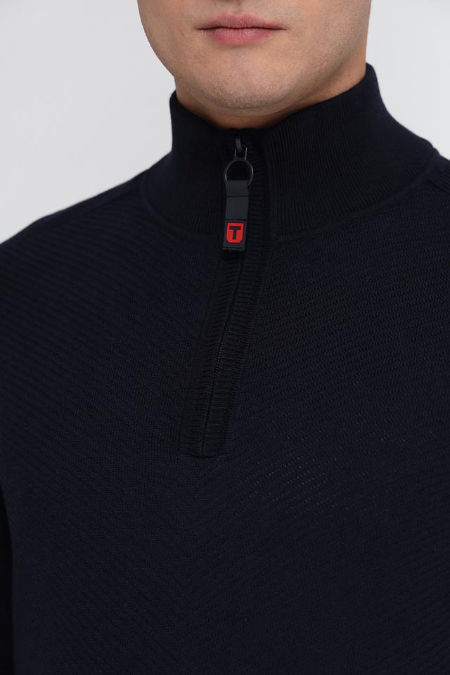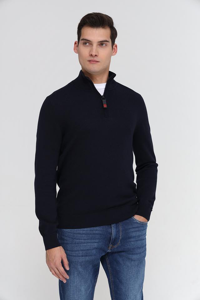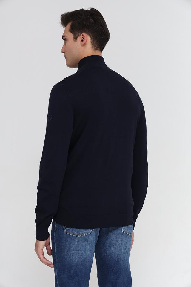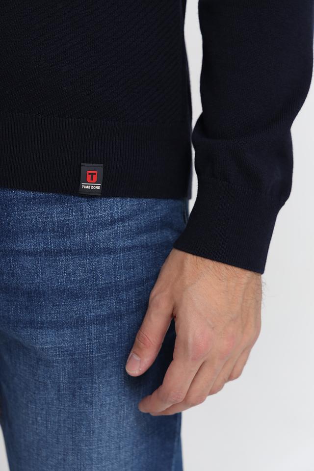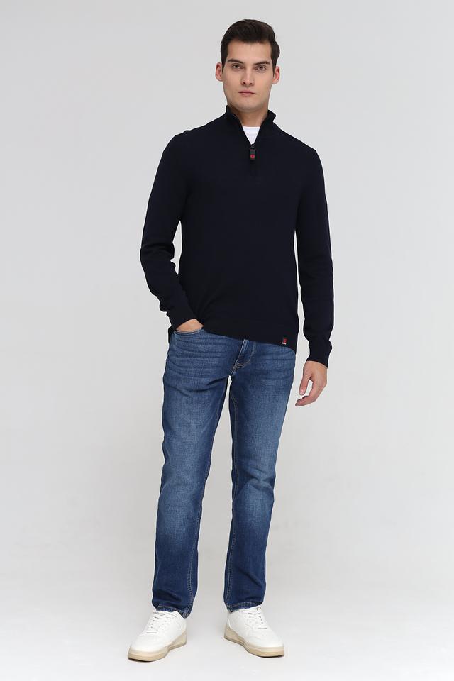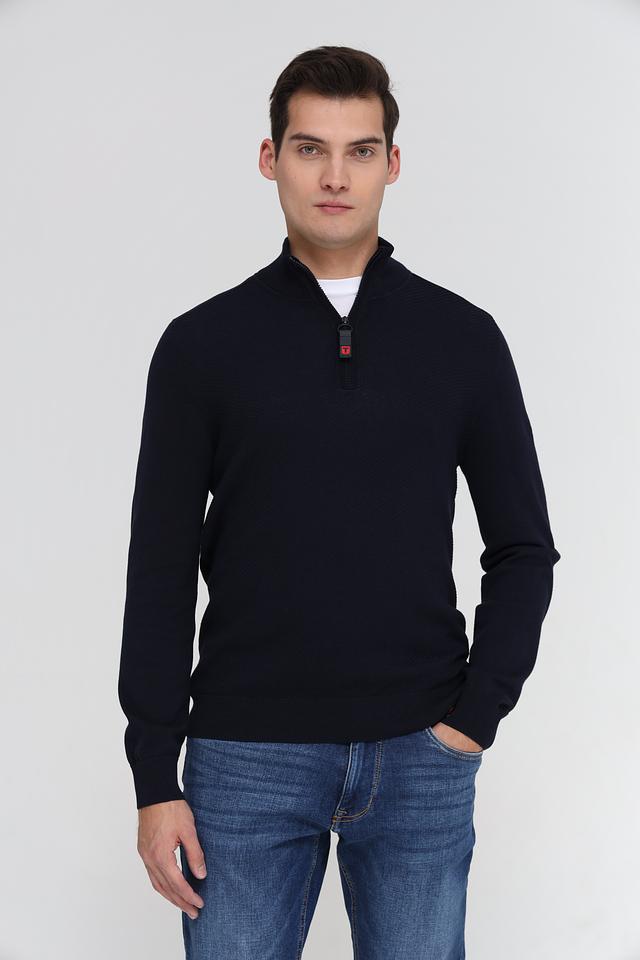 Мужской джемпер Time Zone темно-синего цвета с короткой молнией на воротнике. Изготовлен из мягкого и приятного к телу сочетания вискозы и хлопка, обеспечивающего комфорт в носке. Состав: вискоза 50%, хлопок 50%