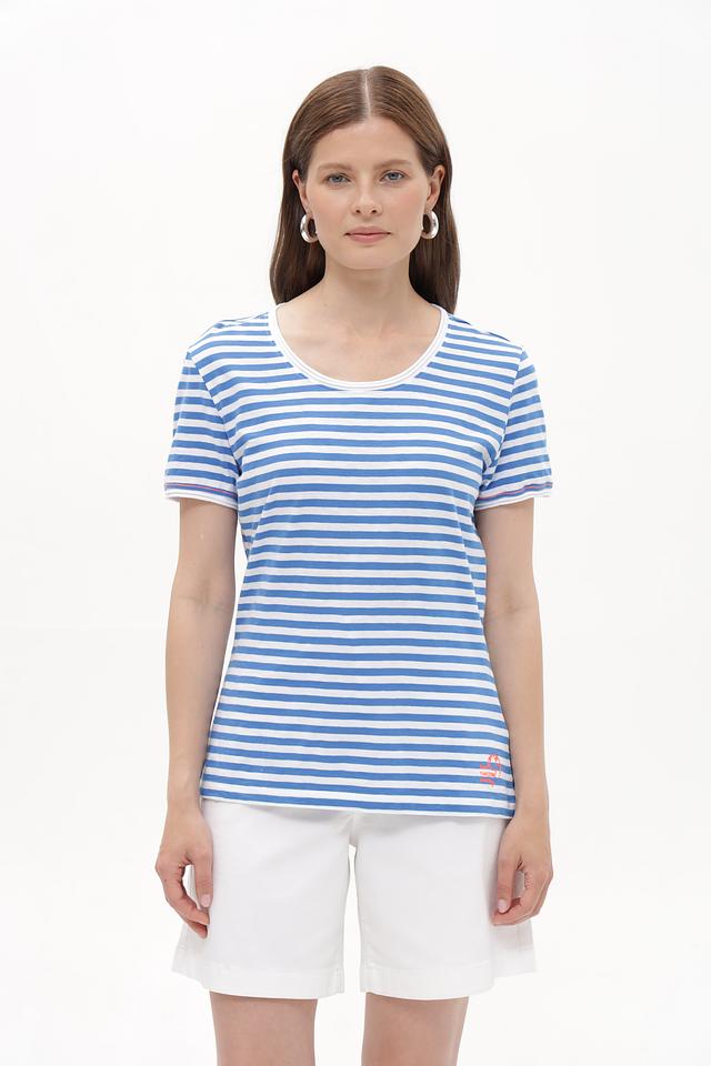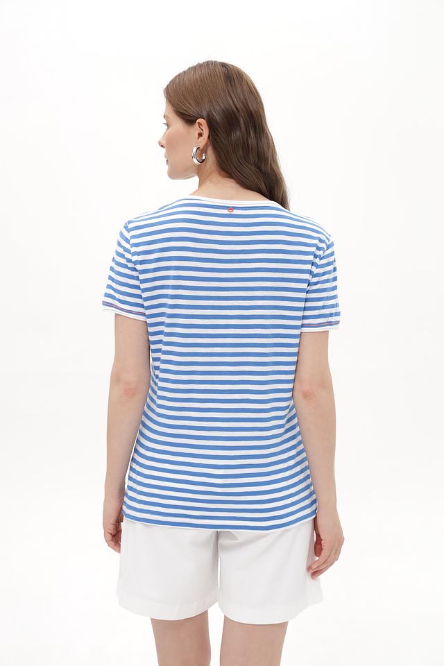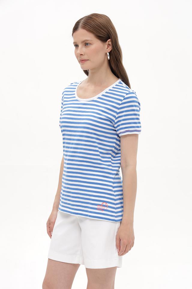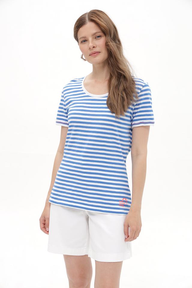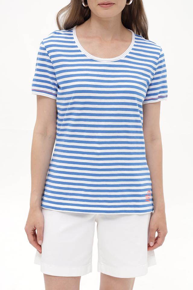 Женская футболка Time Zone голубого цвета в классическую полоску. Изготовлена из 100% хлопка, обеспечивающего комфорт в носке. Отличный выбор для повседневного гардероба. Состав: хлопок 100%