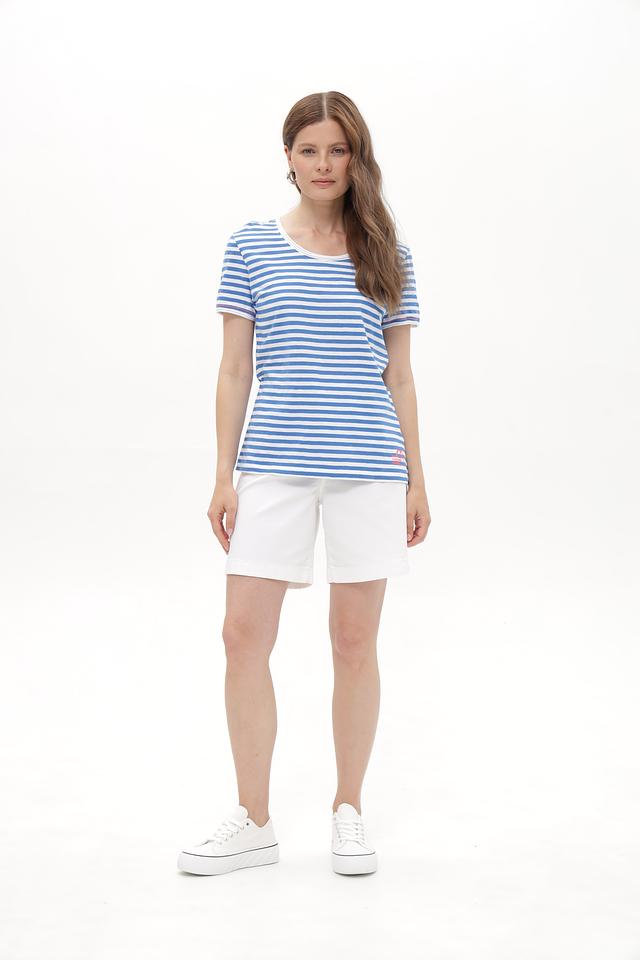 Женская футболка от бренда Time Zone выполнена в классическом стиле с полосатым рисунком. Модель имеет прямой крой, короткие рукава и округлый вырез горловины.