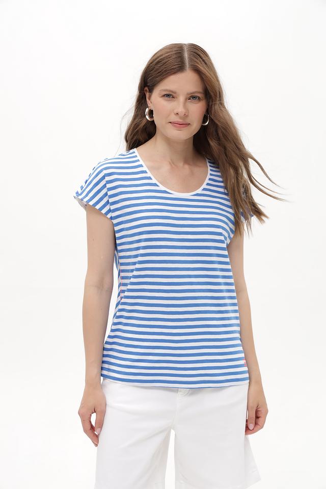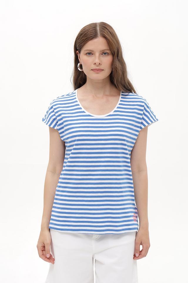 Женская футболка Time Zone голубого цвета в классическую полоску. Изготовлена из 100% хлопка, обеспечивающего комфорт и воздухопроницаемость. Отличный выбор для повседневного образа. Состав: хлопок 100%