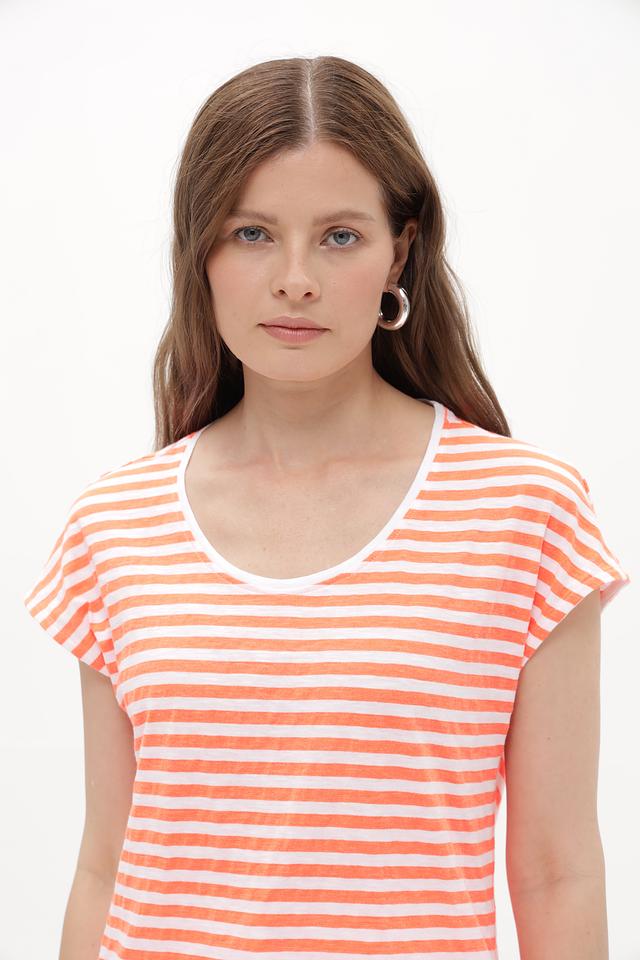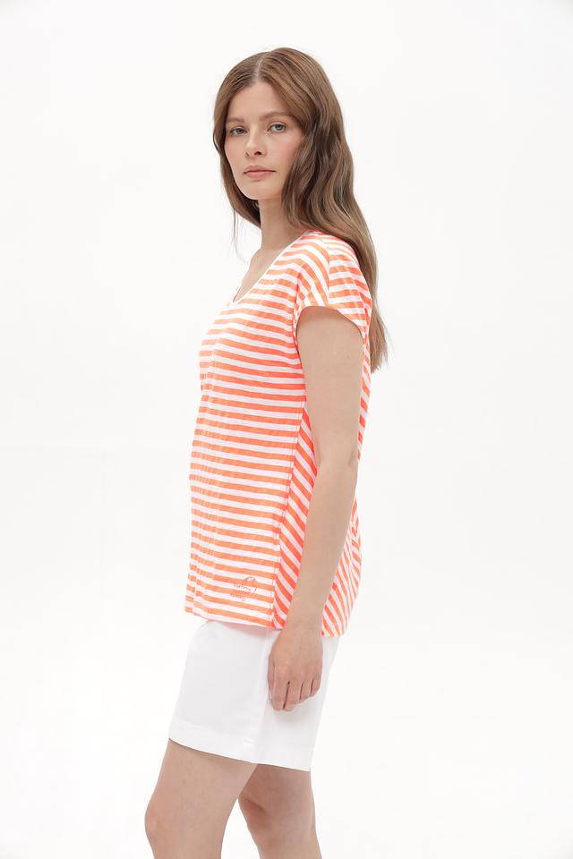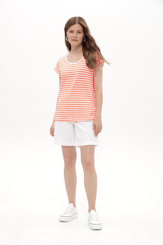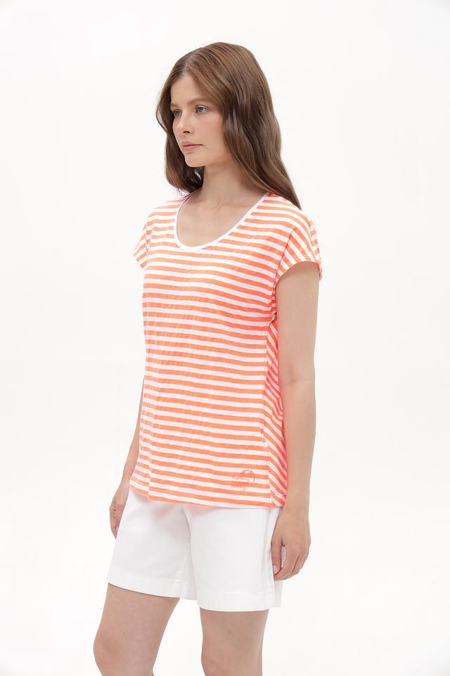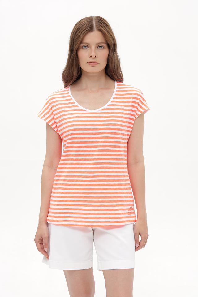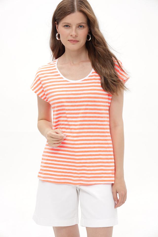 Эта женская футболка от Time Zone станет отличным дополнением к вашему гардеробу. Модель выполнена в приятной персиковой расцветке с классической полоской, что придает ей универсальность и легкость в сочетании с другими вещами.