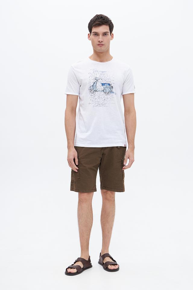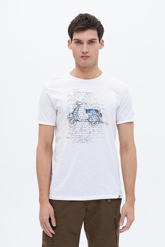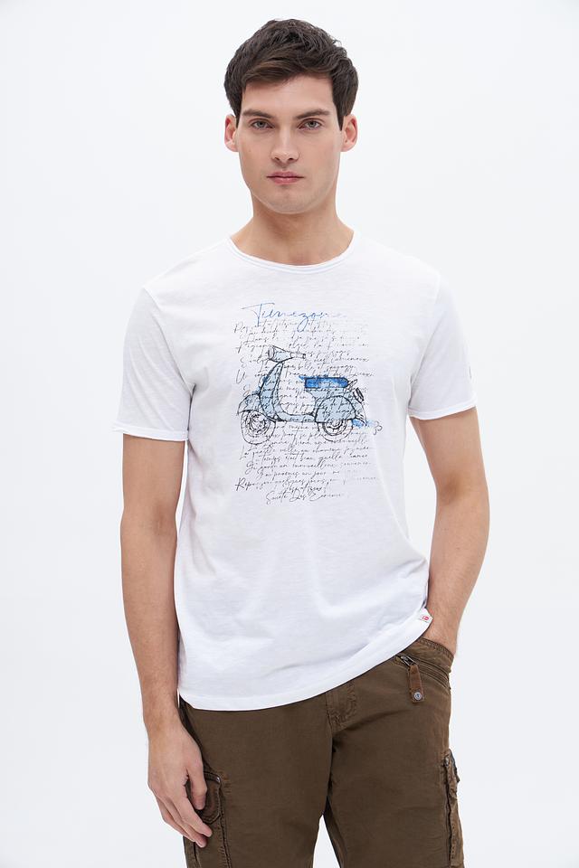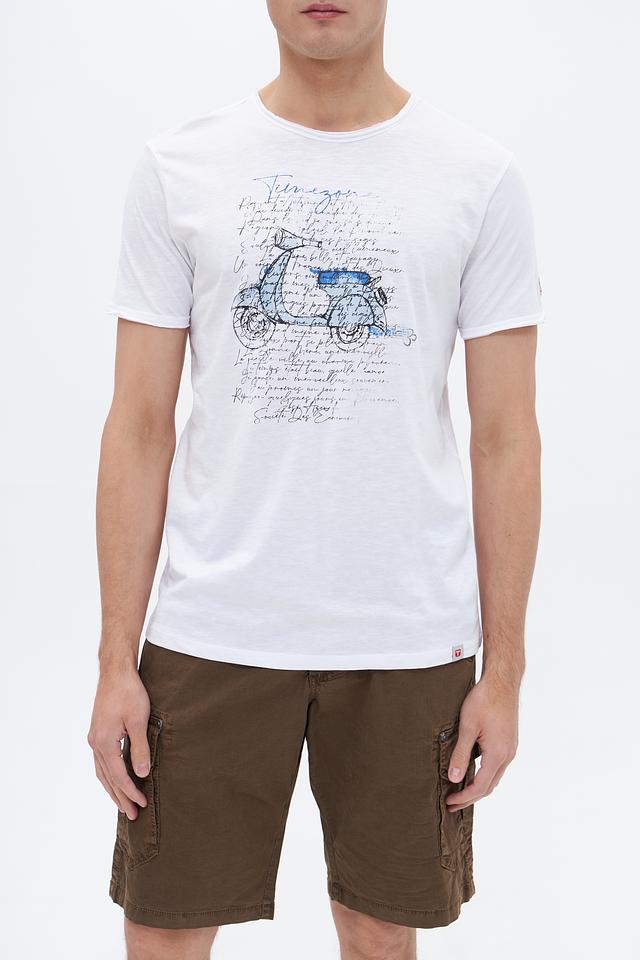 Белая футболка Time Zone с оригинальным принтом в виде мотороллера. Изготовлена из 100% хлопка, обеспечивающего комфорт и воздухопроницаемость. Состав: хлопок 100%