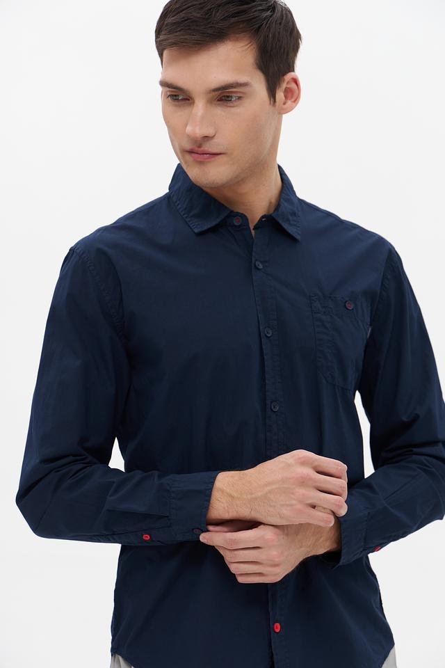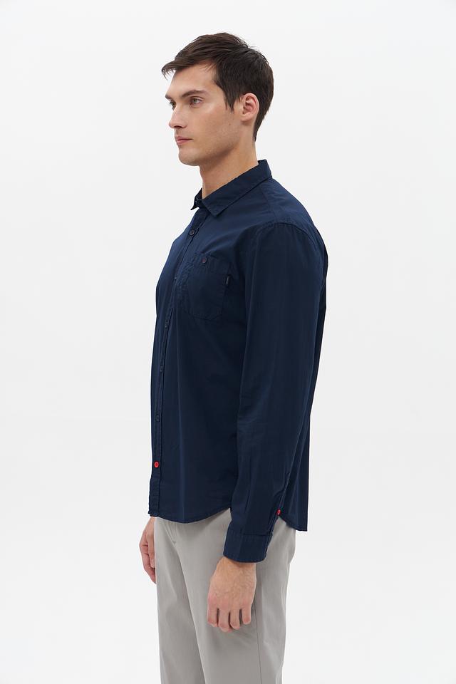Основной цвет рубашки – насыщенный синий, который легко сочетается с различными элементами гардероба. На груди расположен накладной карман с декоративной отделкой, а на манжетах и воротнике – контрастная красная окантовка, добавляющая изюминку.