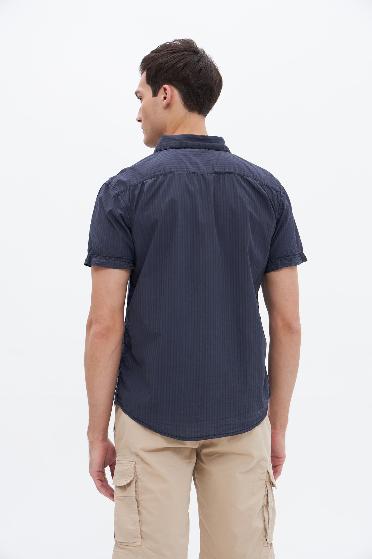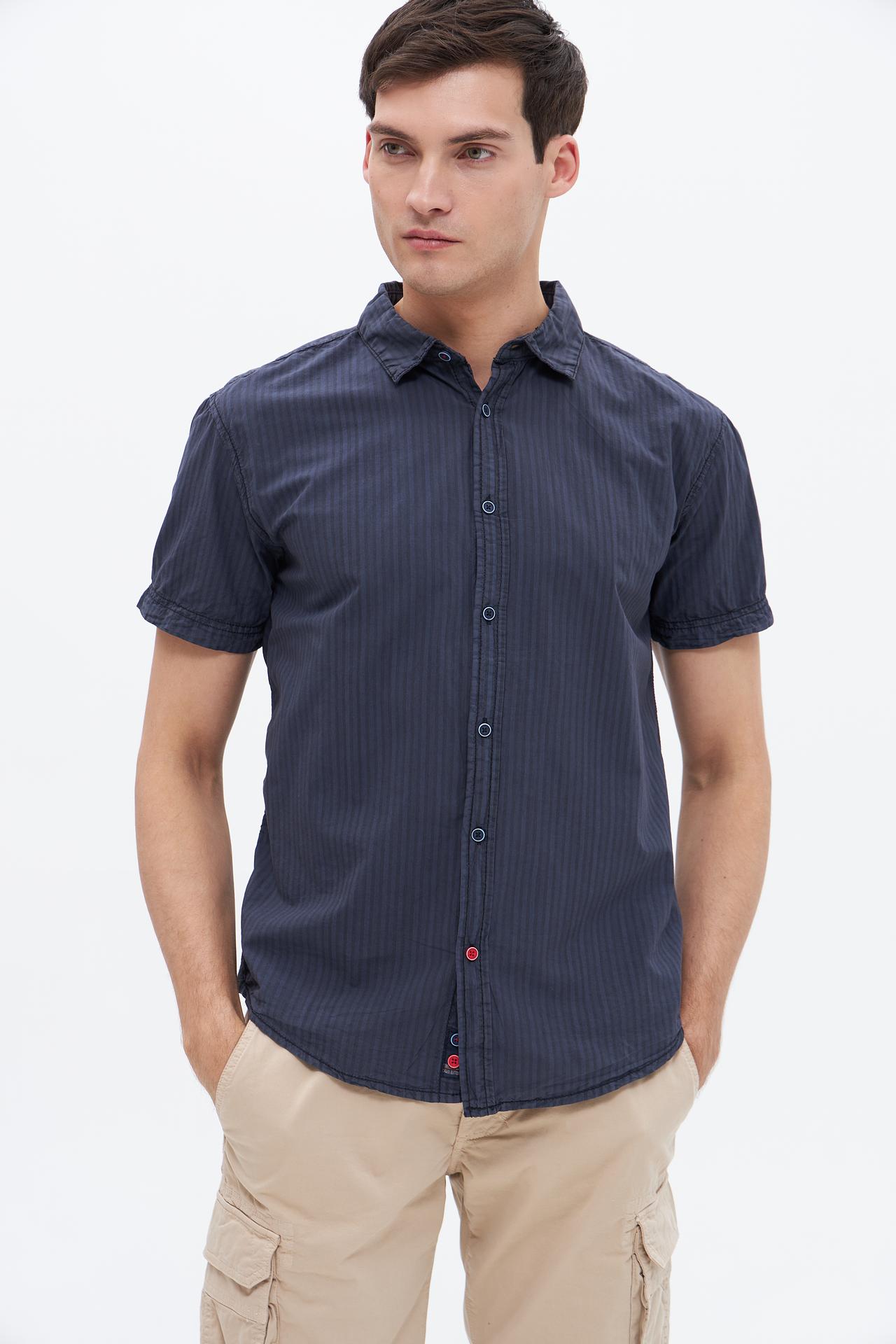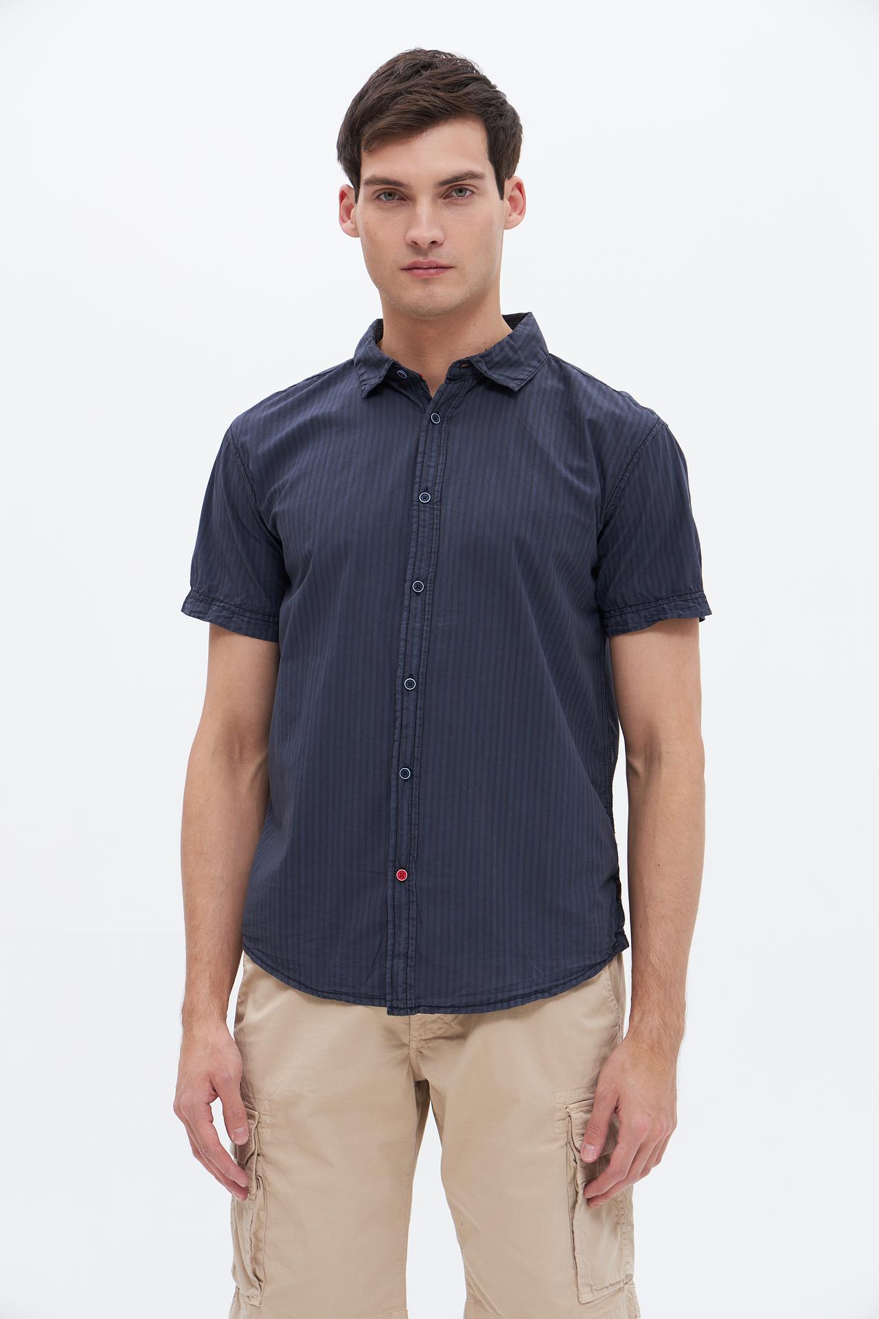 - Дизайн: Рубашка представлена в элегантном темно-синем цвете с вертикальным рисунком. Лаконичный дизайн делает её подходящей как для повседневной носки, так и для неофициальных мероприятий.