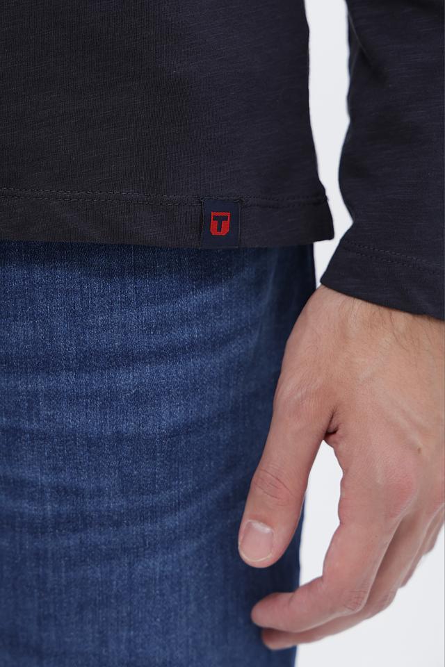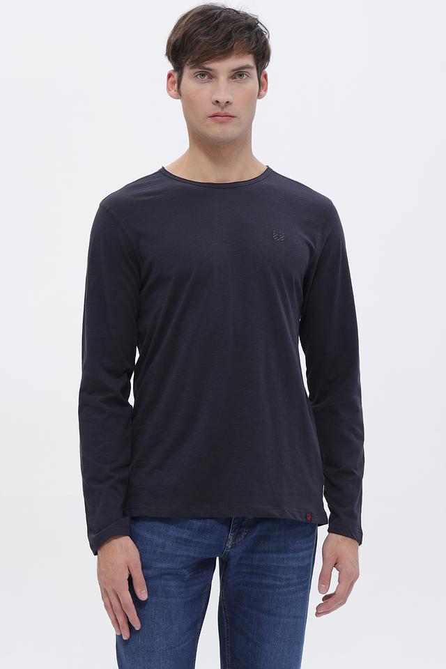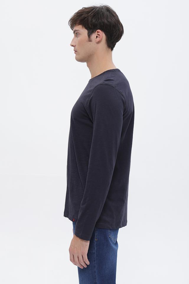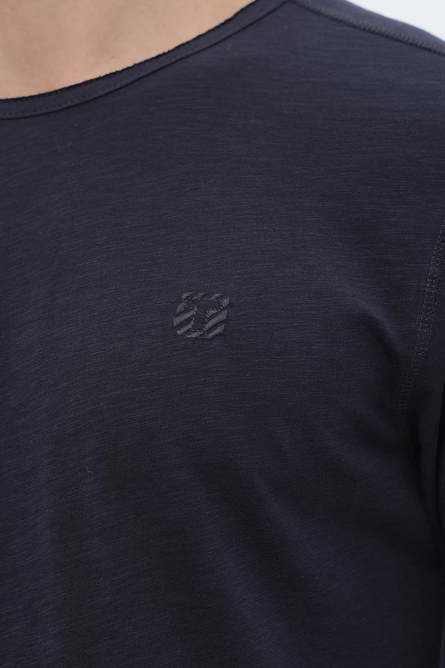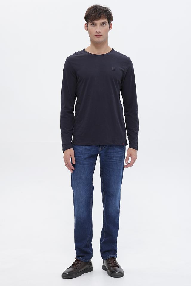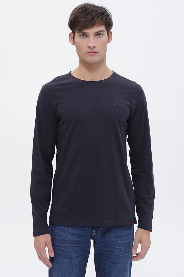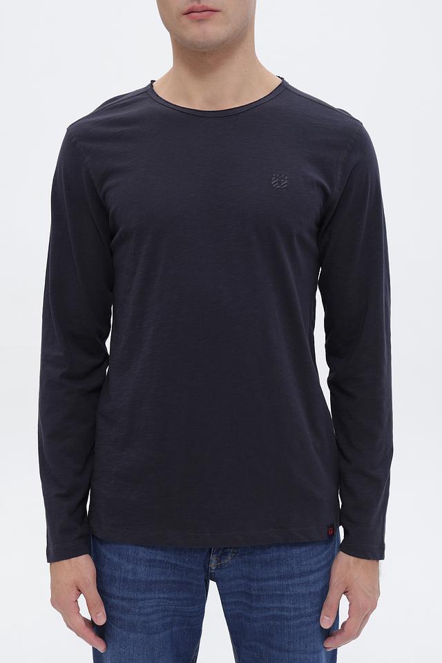Футболка имеет классический крой с длинными рукавами и круглым вырезом горловины. Темно-синий цвет делает ее универсальной и легко сочетаемой с различными элементами гардероба. Небольшой логотип бренда, расположенный на груди, добавляет сдержанную элегантность.