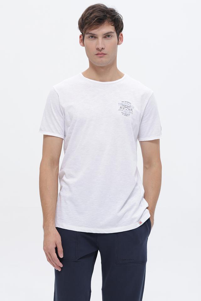 Белая футболка Time Zone с круглым вырезом и оригинальным принтом на груди. Изготовлена из 100% хлопка, обеспечивающего комфорт и воздухопроницаемость. Отличный выбор для повседневного образа. Состав: хлопок 100%