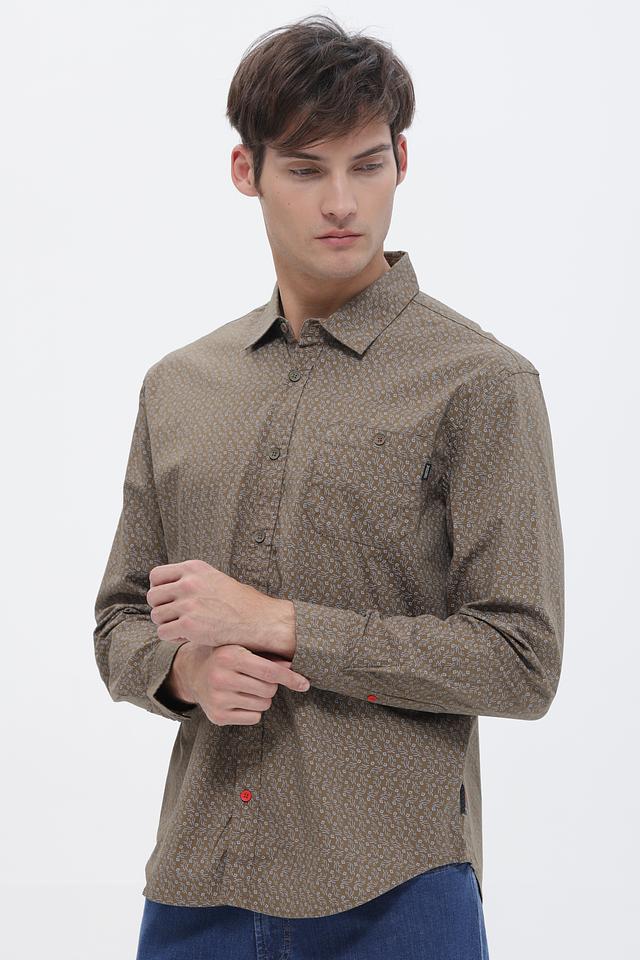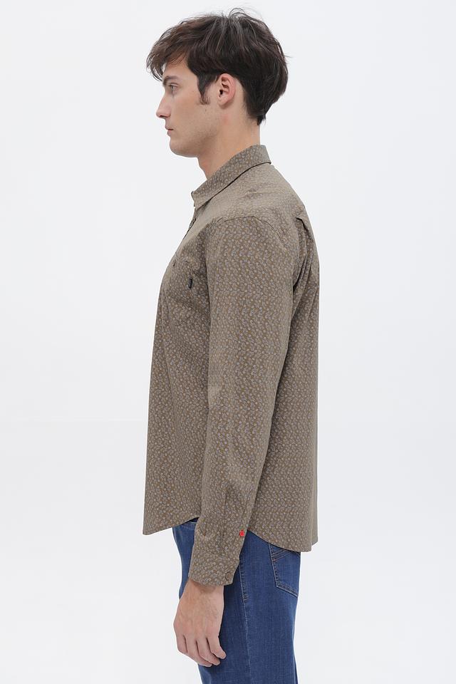 Мужская рубашка Time Zone хаки цвета с мелким принтом – стильное и комфортное решение для повседневного образа. Изготовлена из хлопка с добавлением эластана для удобства носки и сохранения формы. Состав: хлопок 97%, эластан 3%