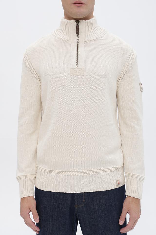 Джемпер имеет классический крой с коротким воротником и молнией, что придает ему современный вид. На левой стороне груди расположен небольшой логотип бренда. Рельефная вязка на плечах и манжетах добавляет текстуры и визуального интереса.
