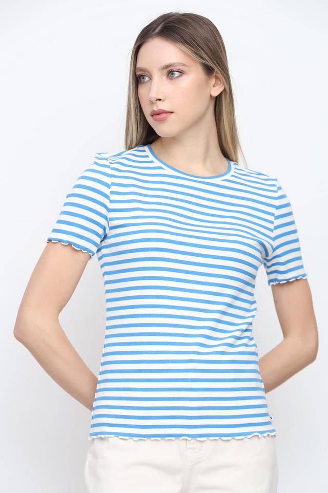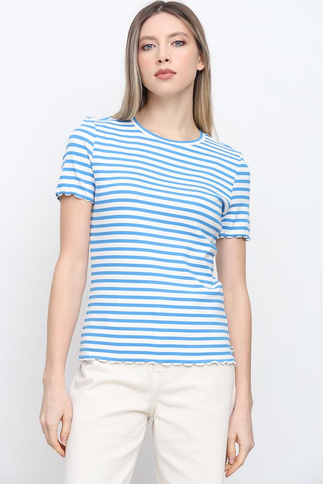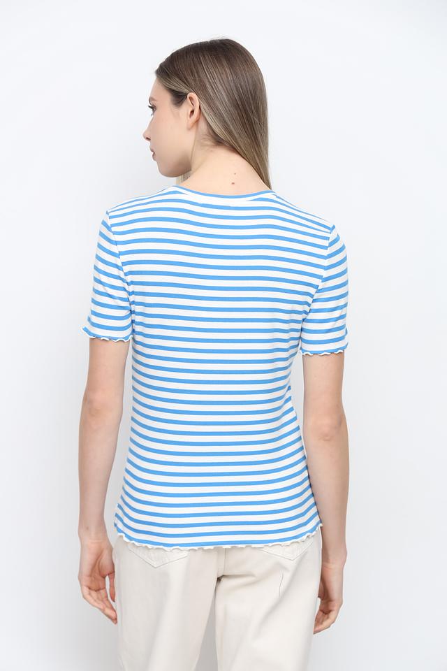 Футболка имеет классический крой и короткие рукава с декоративной оборкой. Голубая полоска придает ей свежий и летний вид. Отделка края в виде рюши добавляет изысканности и женственности.