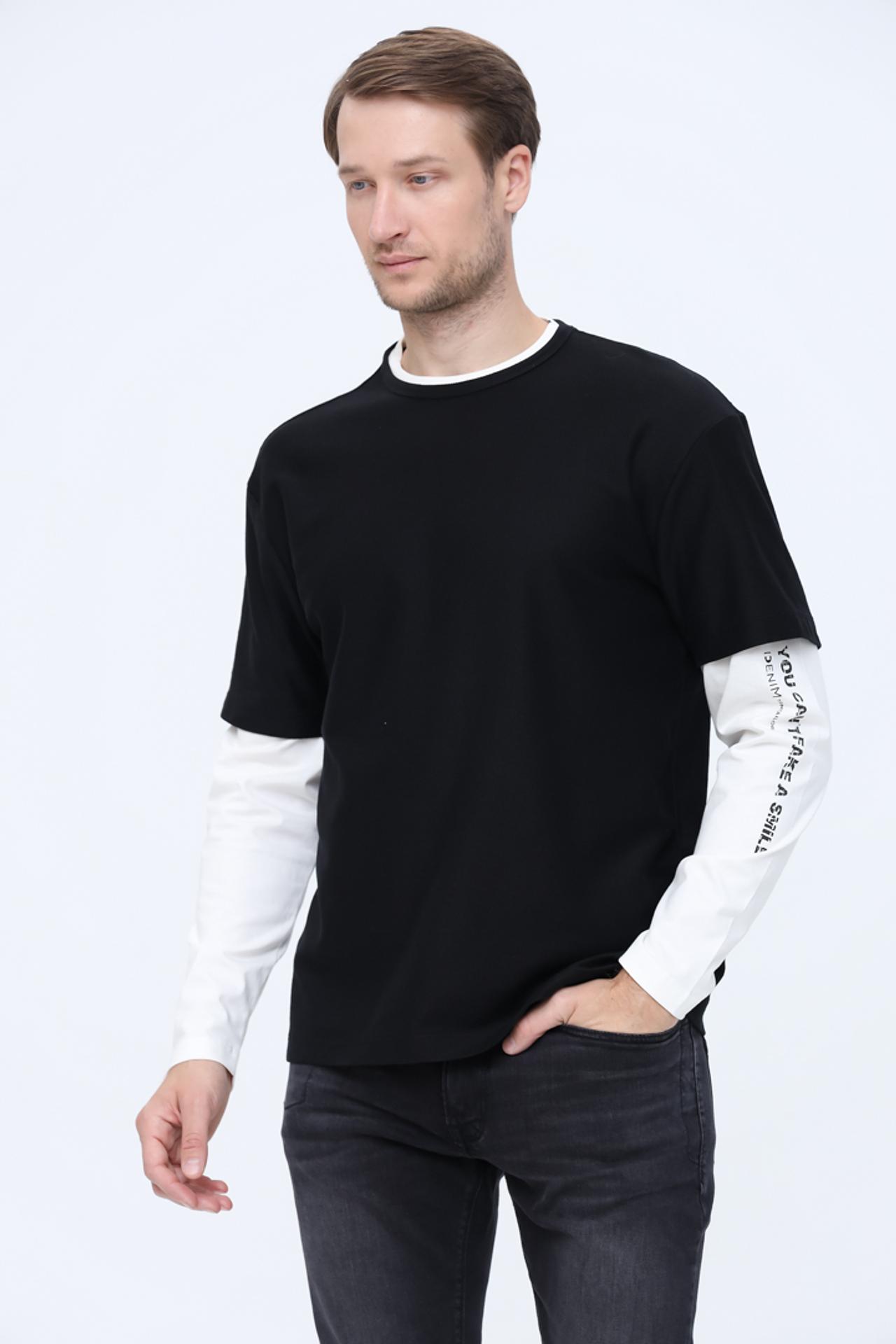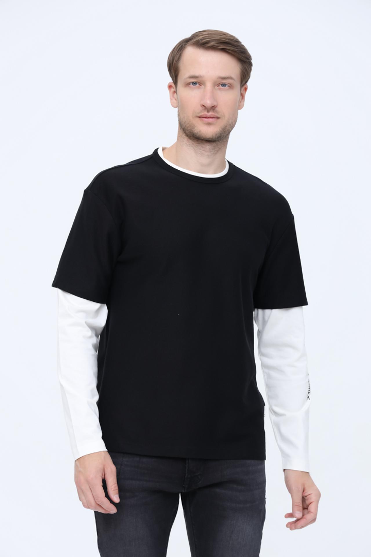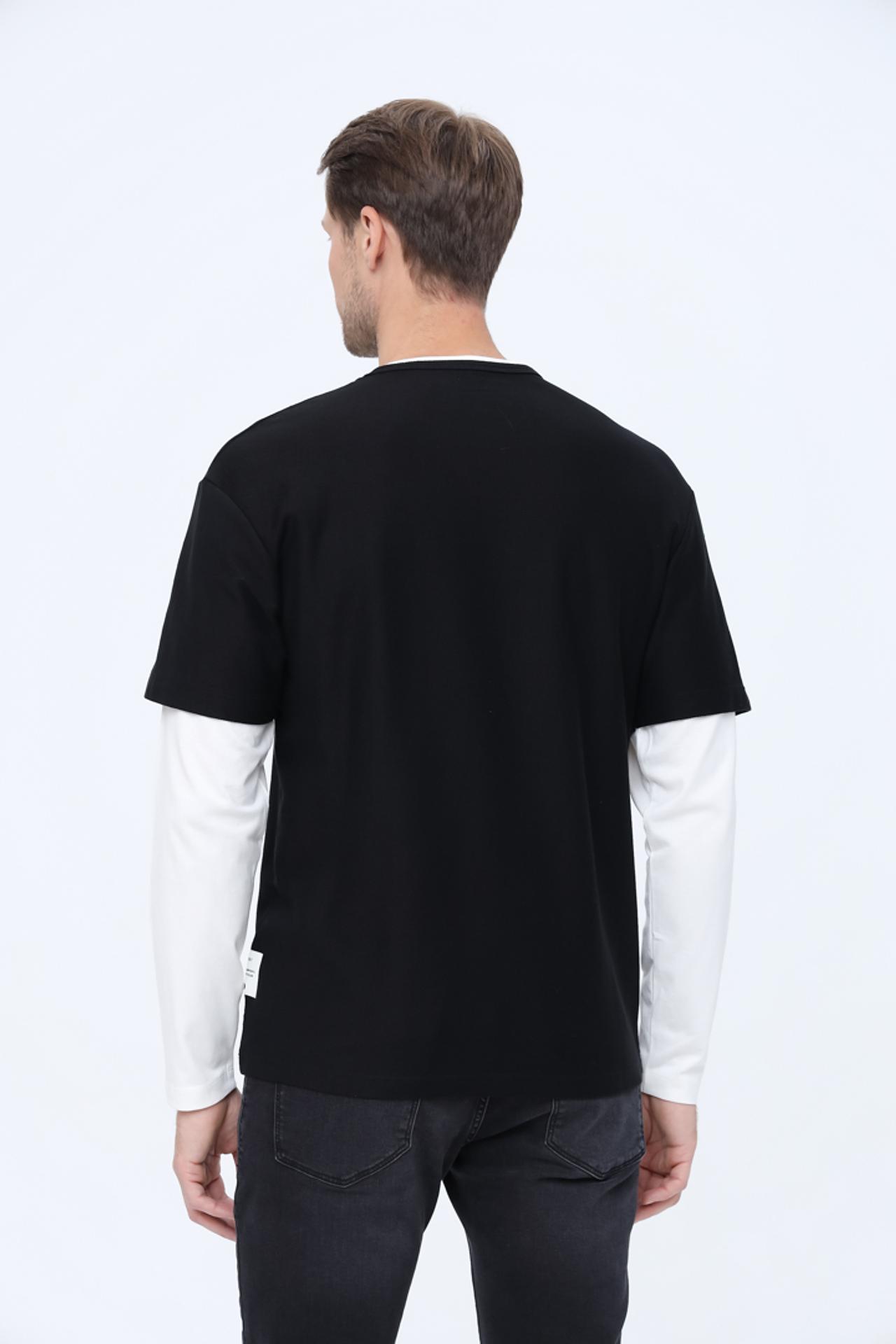 - Дизайн: Уникальная конструкция с имитацией двухслойности (черная футболка поверх белой лонгслива) придает образу многогранность.