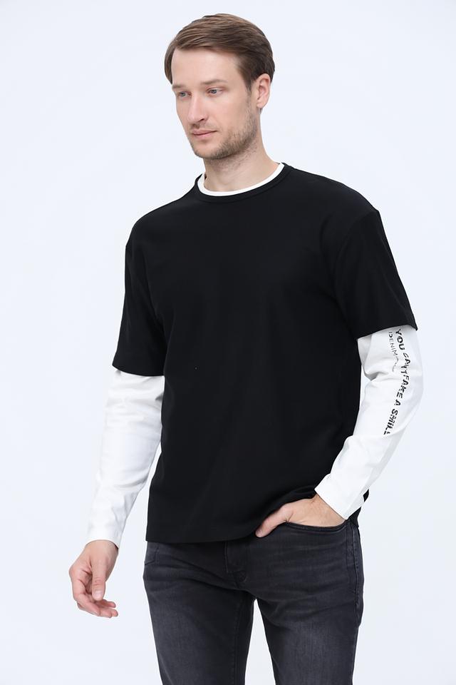 Особенностью данной модели является двухслойный дизайн: чёрная футболка с коротким рукавом надета поверх белой футболки с длинным рукавом, создавая эффект многослойности. На рукавах белой подложки расположен текстовый принт, добавляющий образу оригинальности.