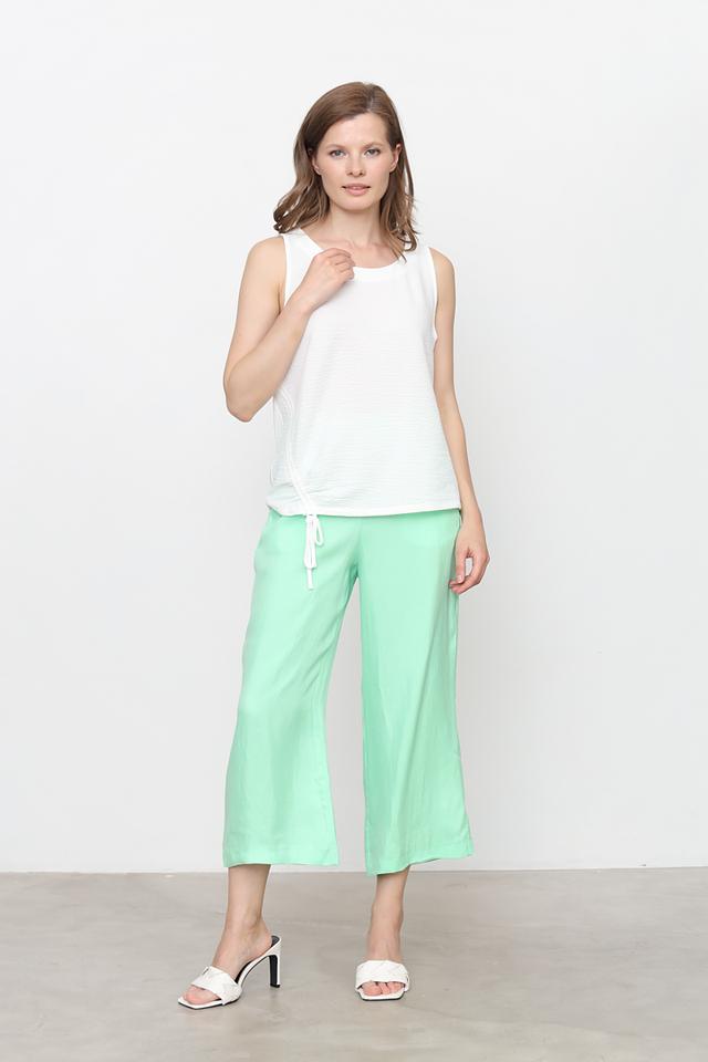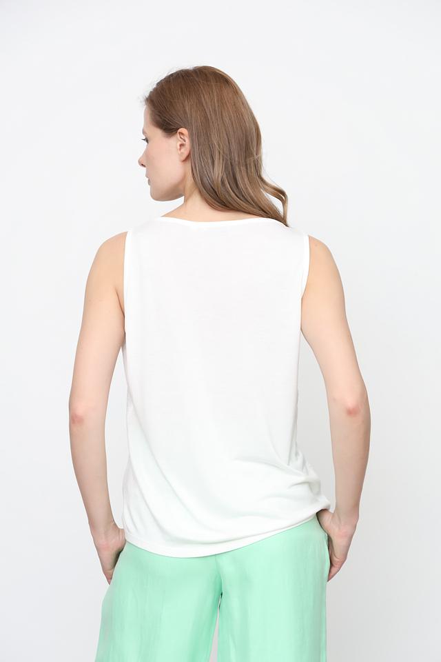 Топ имеет классический крой без рукавов и округлый вырез горловины. Боковые завязки позволяют регулировать силуэт и создавать различные образы. Эта модель идеально подходит для повседневной носки, сочетается с джинсами, шортами, юбками и брюками.