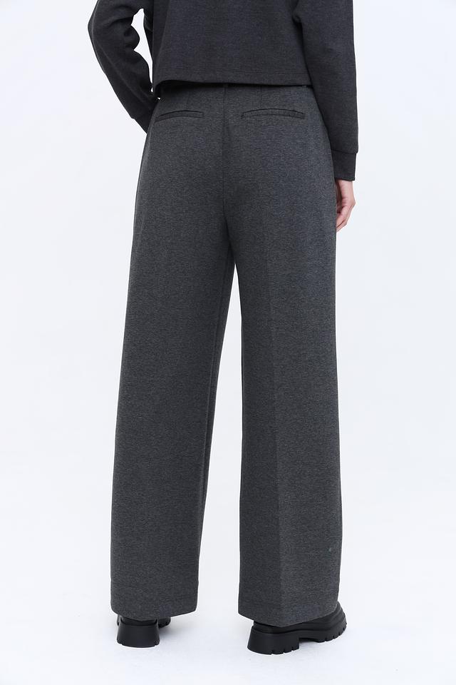 Брюки имеют прямой крой, высокую посадку и широкие штанины, что создает элегантный и современный силуэт. Застежка на молнию и пуговицу обеспечивает надежную фиксацию. Наличие боковых карманов добавляет функциональности.