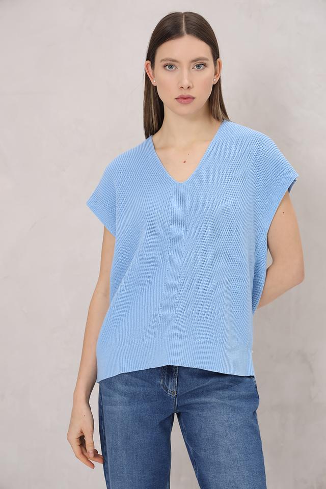Женский жилет Tom Tailor голубого цвета выполнен из мягкого вязаного полотна. Модель имеет V-образный вырез и свободный крой, идеально подходит для создания многослойных образов. Состав: хлопок 60%, вискоза 40%