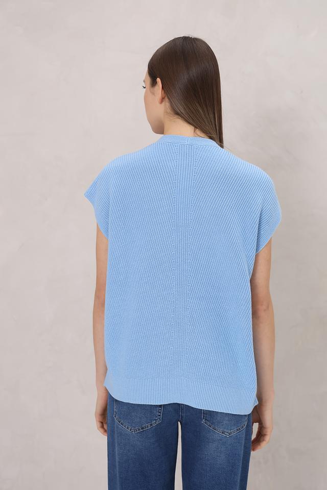Жилет имеет прямой, слегка свободный крой, который обеспечивает комфортную посадку по фигуре. V-образный вырез горловины подчеркивает элегантность силуэта. Изготовлен из приятной на ощупь смеси хлопка и вискозы, что гарантирует комфорт в носке.
