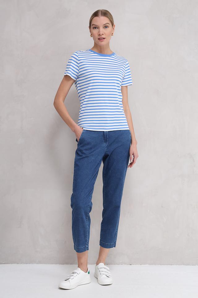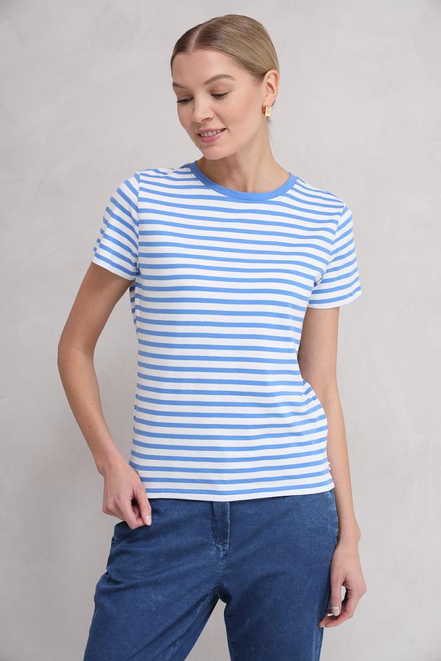 Женская футболка Tom Tailor голубого цвета в классическую полоску. Изготовлена из 100% хлопка, обеспечивающего комфорт и воздухопроницаемость. Отличный выбор для повседневного образа. Состав: хлопок 100%