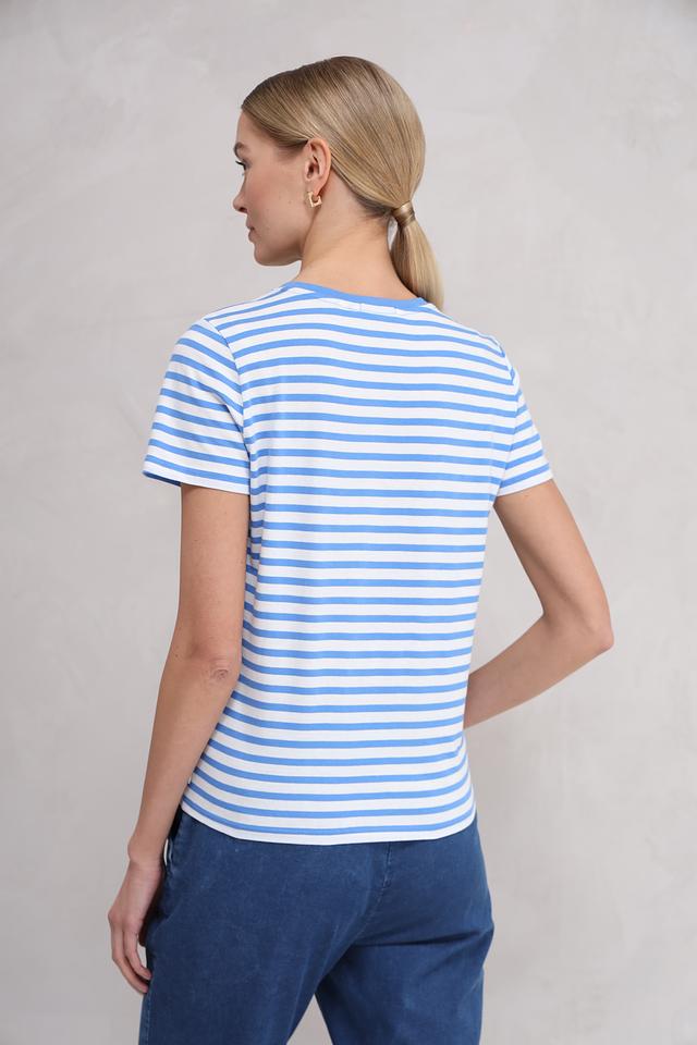 Основной цвет футболки – белый, дополненный тонкими голубыми полосками. Такая расцветка придает изделию свежесть и легкость. Футболка выполнена из высококачественного 100% хлопка, что обеспечивает максимальный комфорт при носке и позволяет коже дышать.