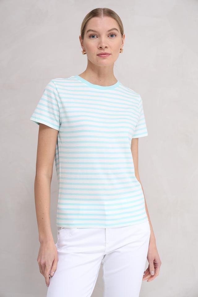 Эта футболка от Tom Tailor – идеальный выбор для создания непринужденного и стильного образа. Футболка выполнена в классическом полосатом дизайне, сочетающем голубой и белый цвета.