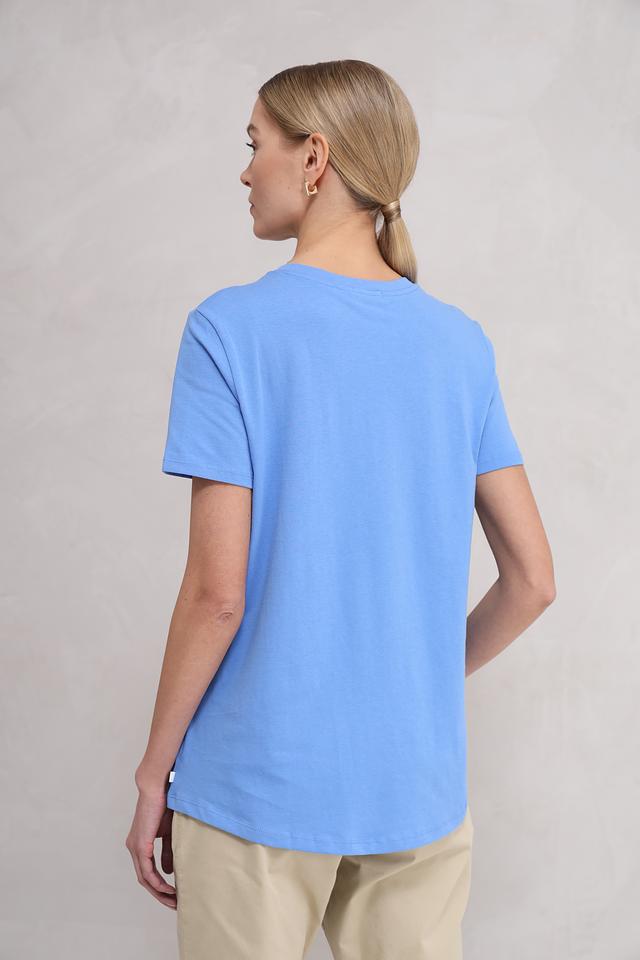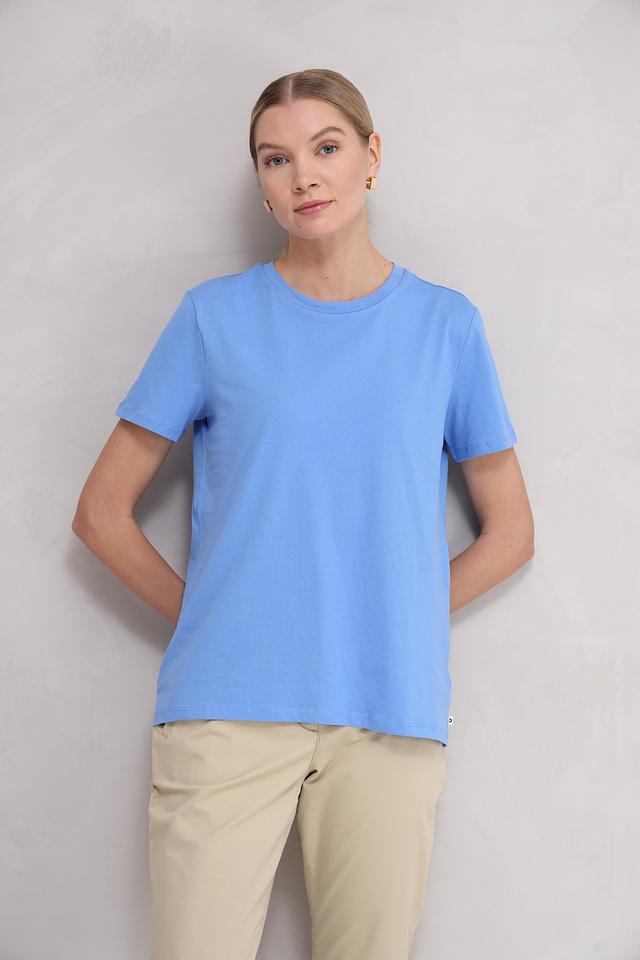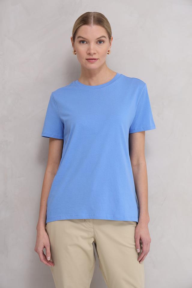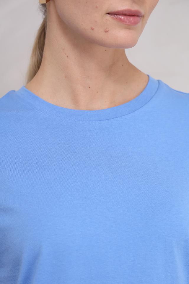 Модель имеет прямой крой, короткие рукава и классический круглый вырез горловины. Футболка выполнена в нежном голубом цвете, который легко сочетается с различными элементами гардероба.