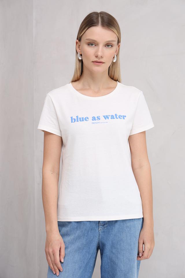 Футболка имеет классический прямой крой, который подходит для любой фигуры. На передней части футболки расположен стильный принт "blue as water" с логотипом бренда, добавляющий образу оригинальность.