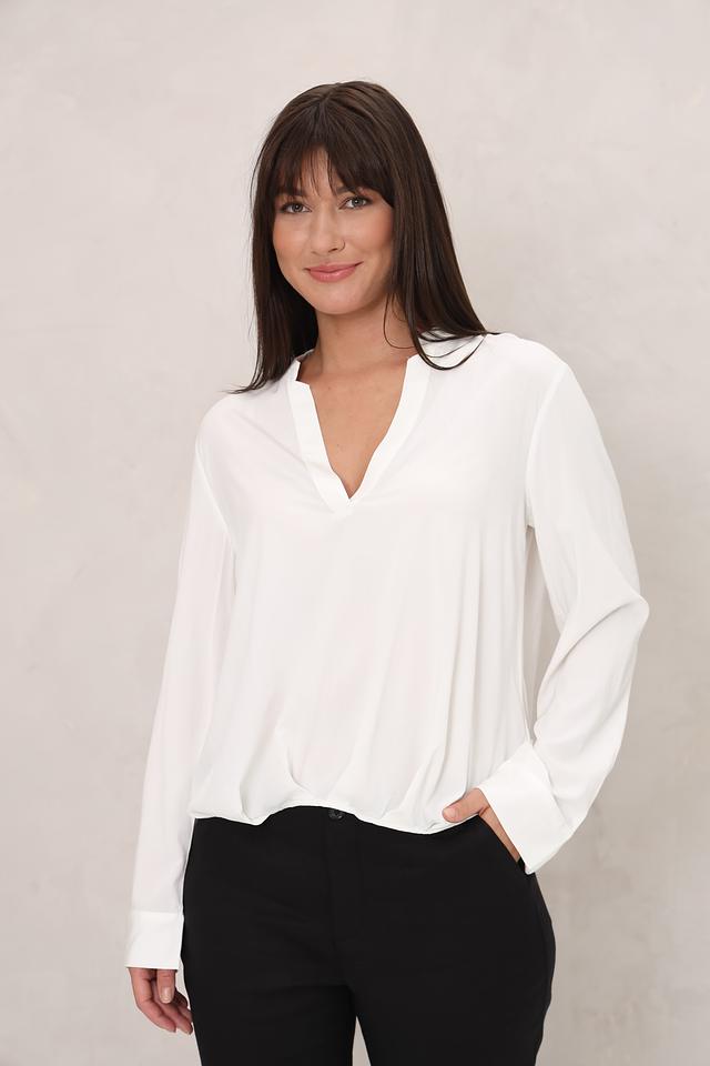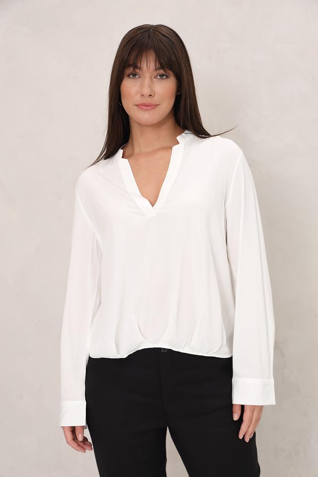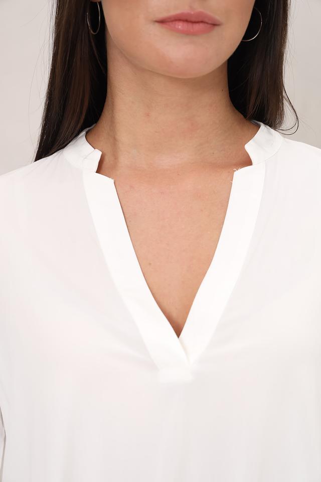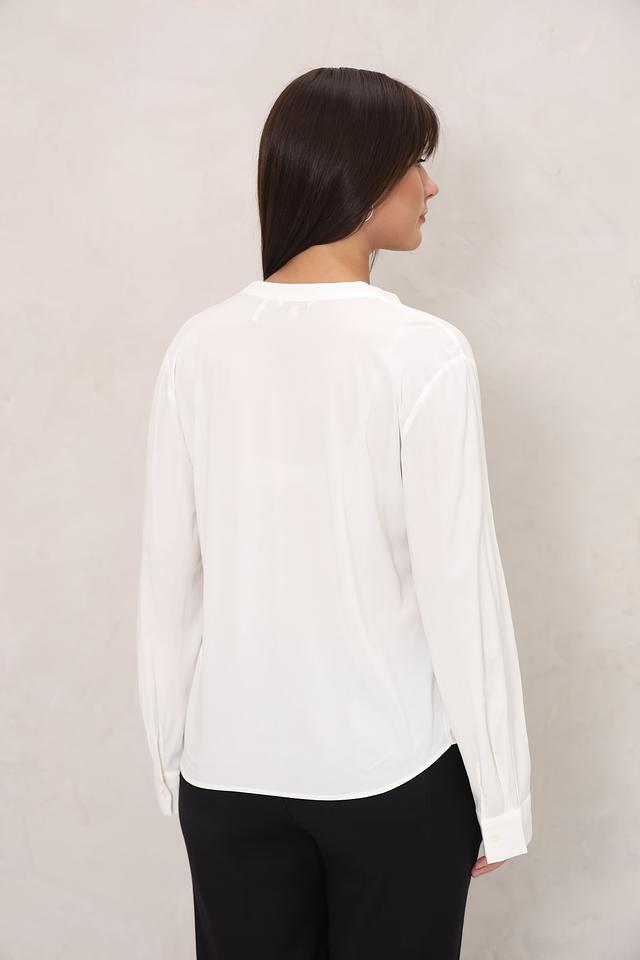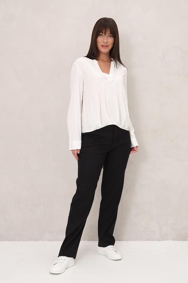 Блуза имеет классический крой с длинными рукавами и V-образным вырезом, который визуально удлиняет шею и делает образ более женственным. Свободный силуэт не сковывает движений и позволяет чувствовать себя уверенно в любой ситуации.