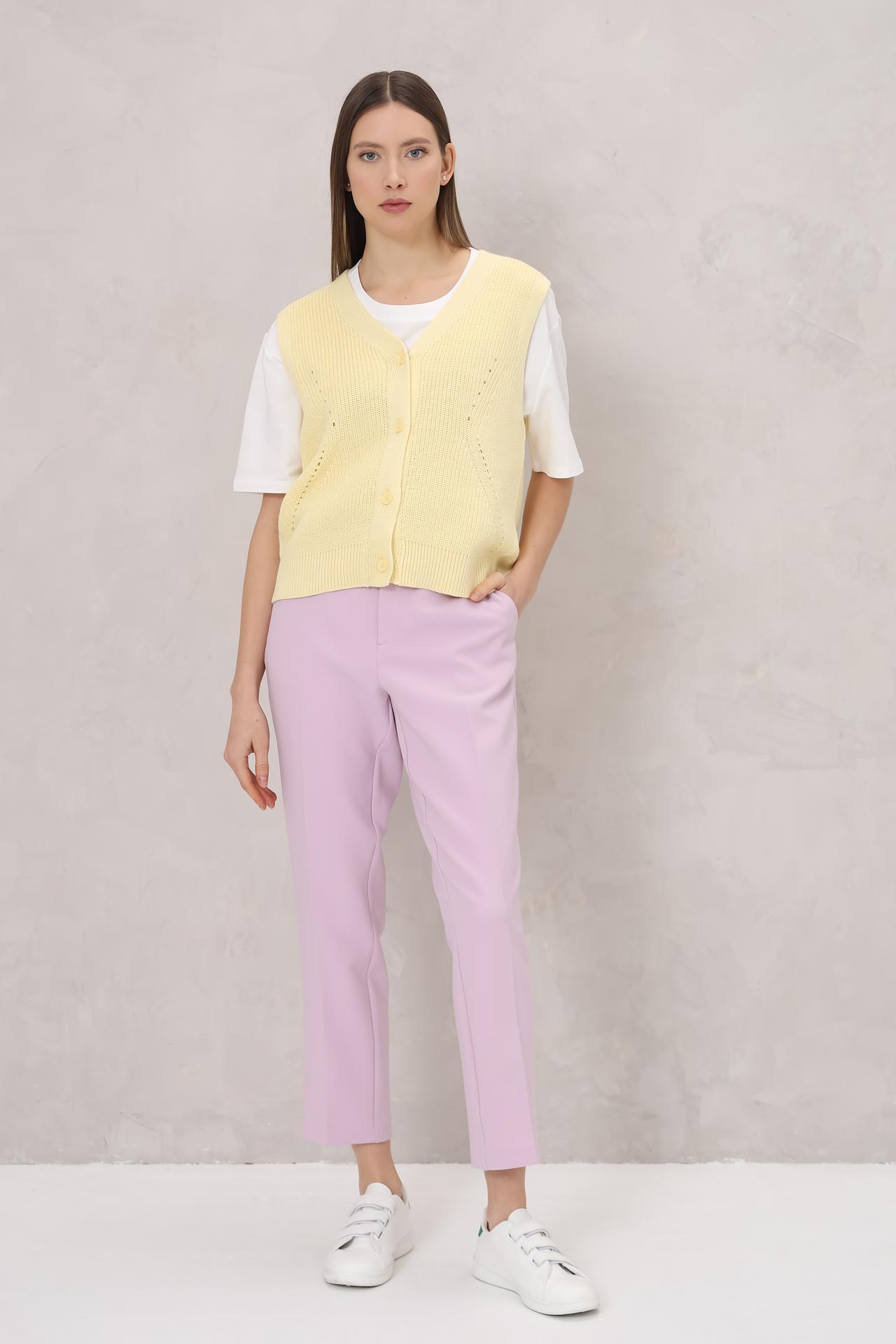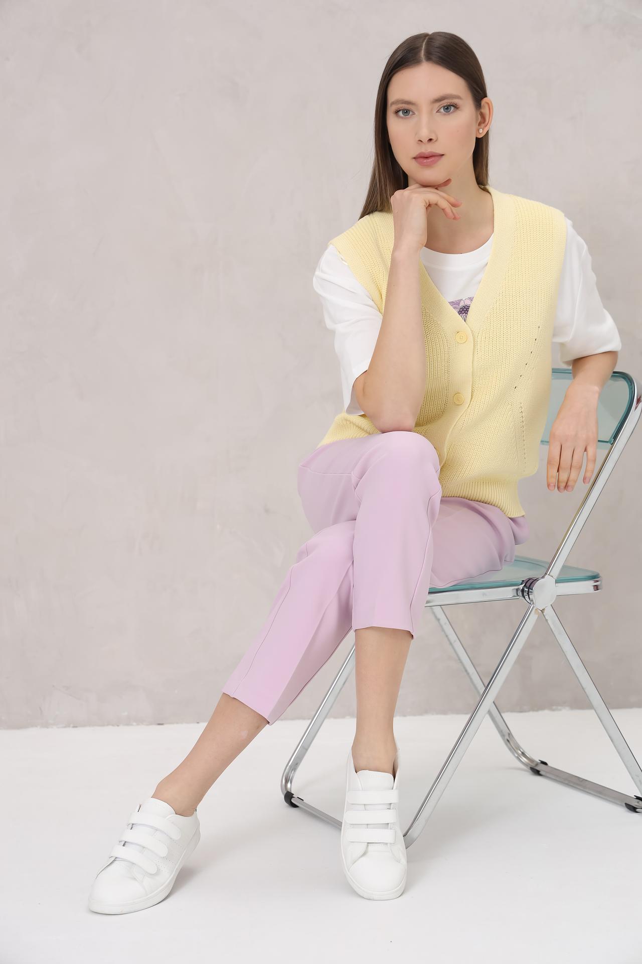 - Универсальный крой: Жилет имеет свободный крой и V-образный вырез, застёгивается на пуговицы в тон. Это позволяет носить его как самостоятельный элемент, так и поверх блузок или футболок.