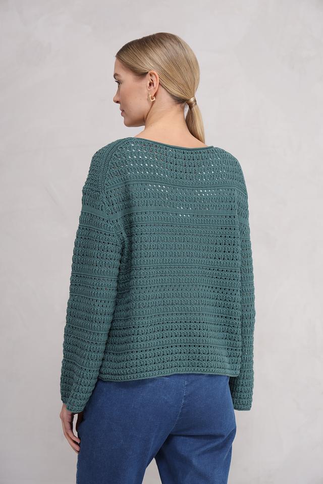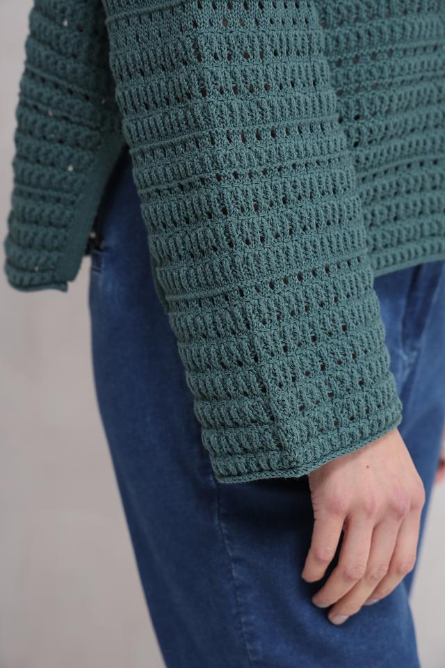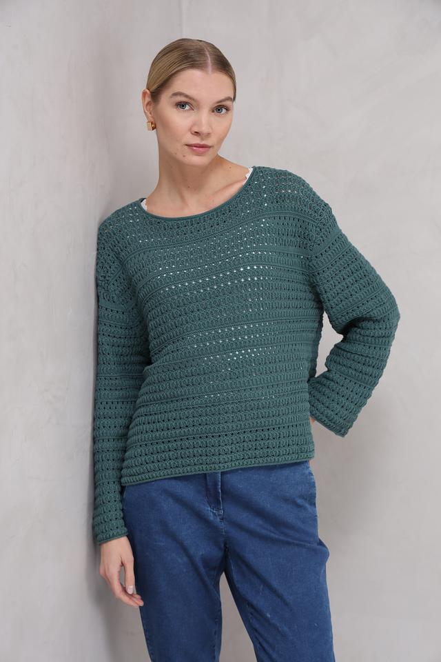 Пуловер имеет приятный зелёный цвет и выполнен в технике ажурного вязания, что придает ему легкость и оригинальность. Круглый вырез горловины и свободный крой делают его универсальным для различных типов фигур.